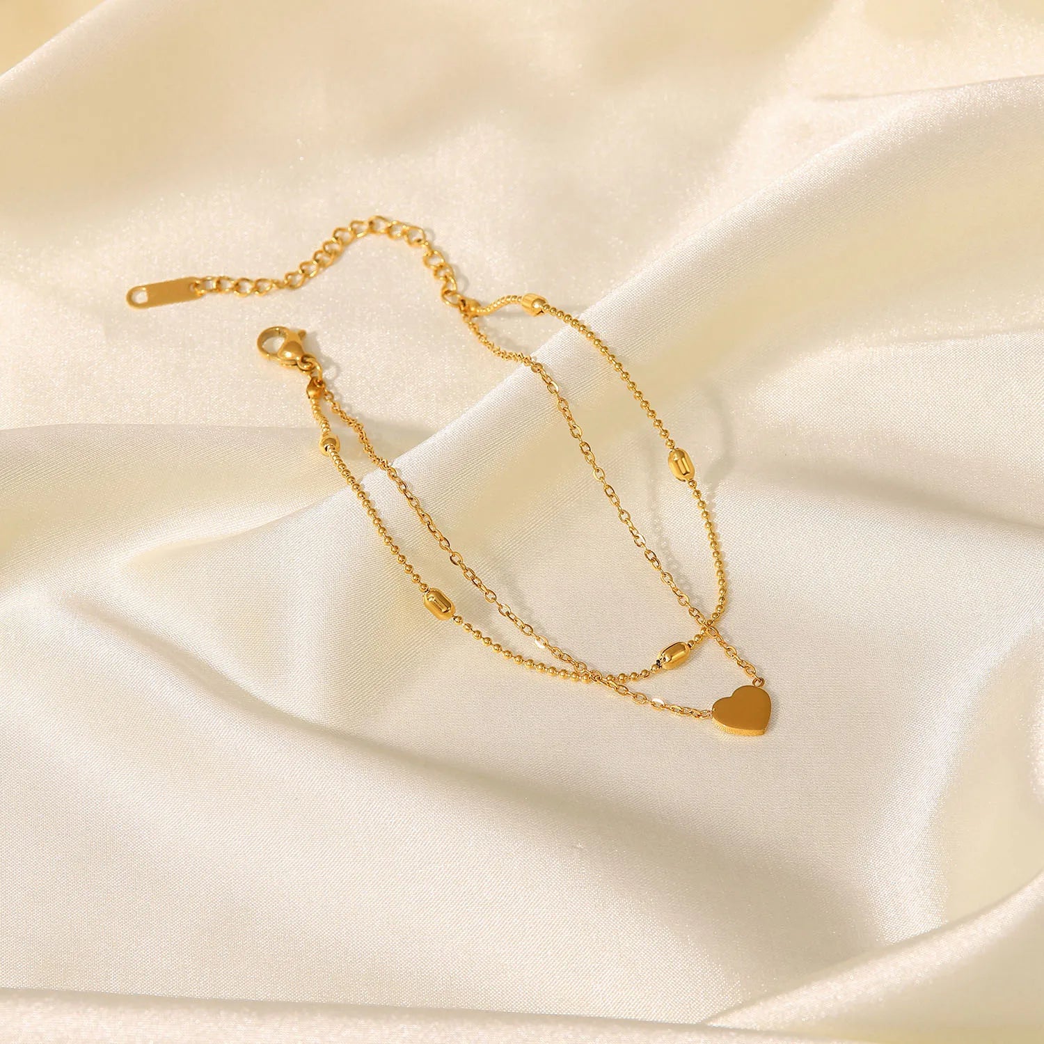 ステンレス304 低ニッケル 水に濡れても錆びにくい 18Kゴールドメッキ アンクレット 2連 チェーン ハート 【YJ03895】