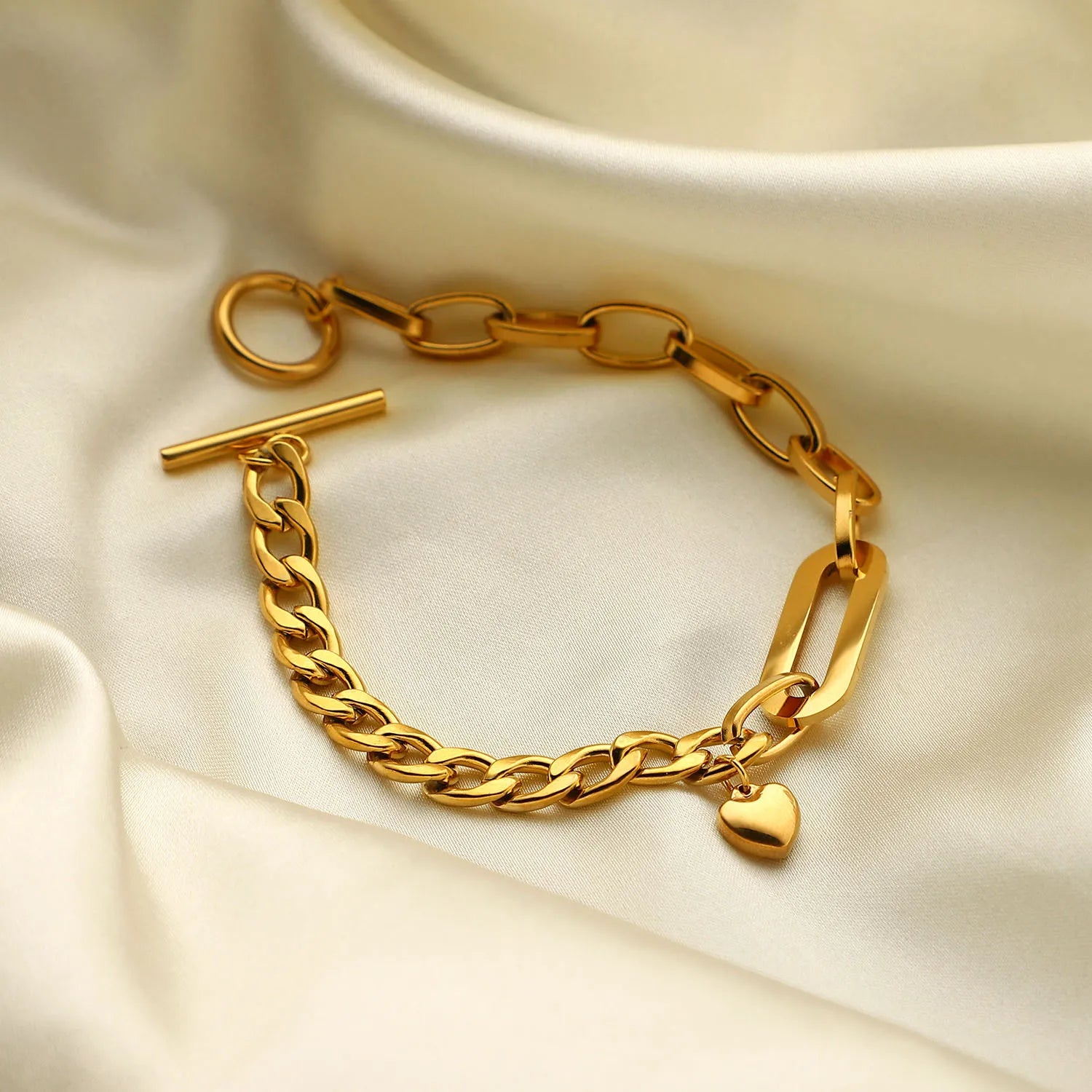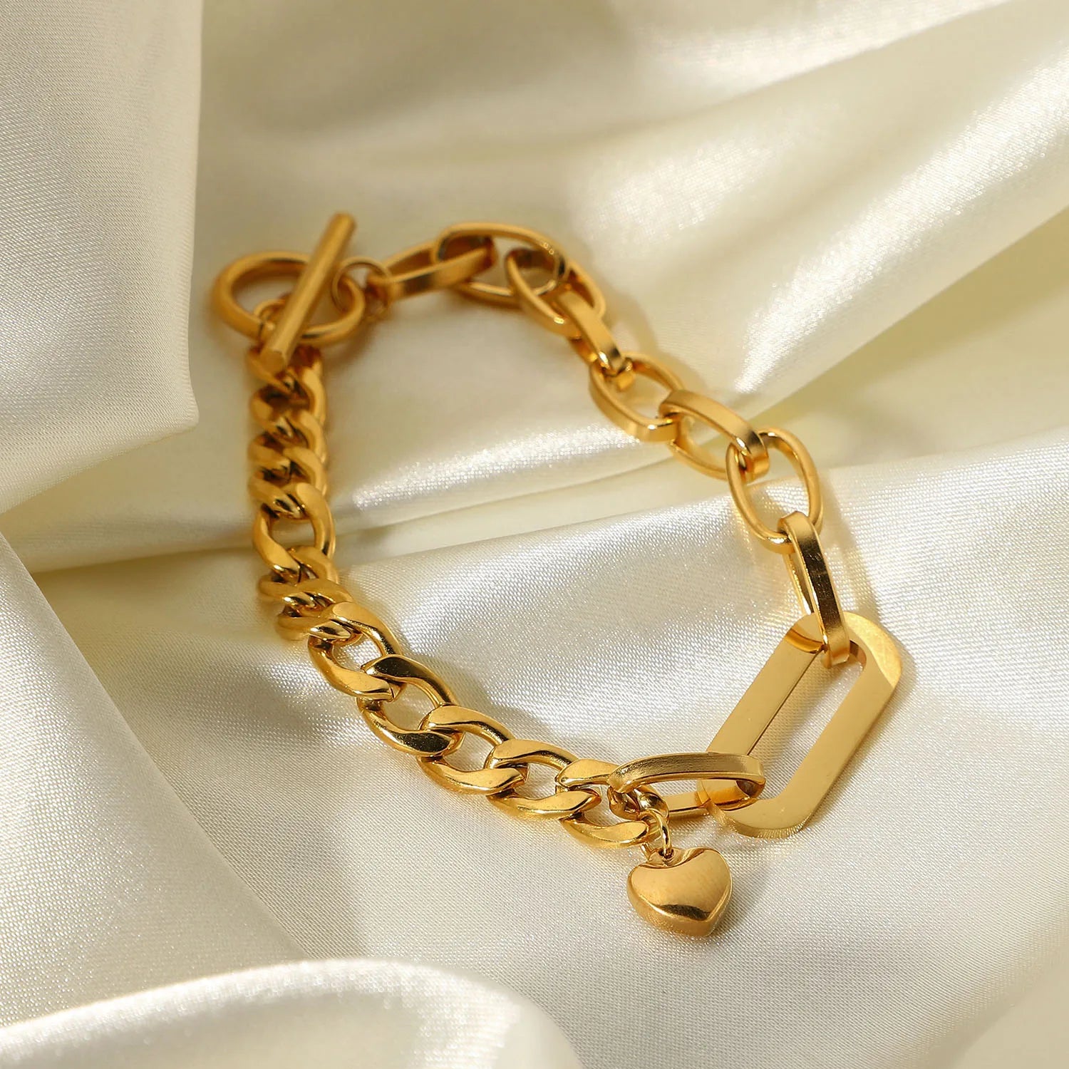ステンレス304 ニッケルフリー 水に濡れても錆びにくい 18Kゴールドメッキ チェーン ハート ブレスレット 【YJ00796】
