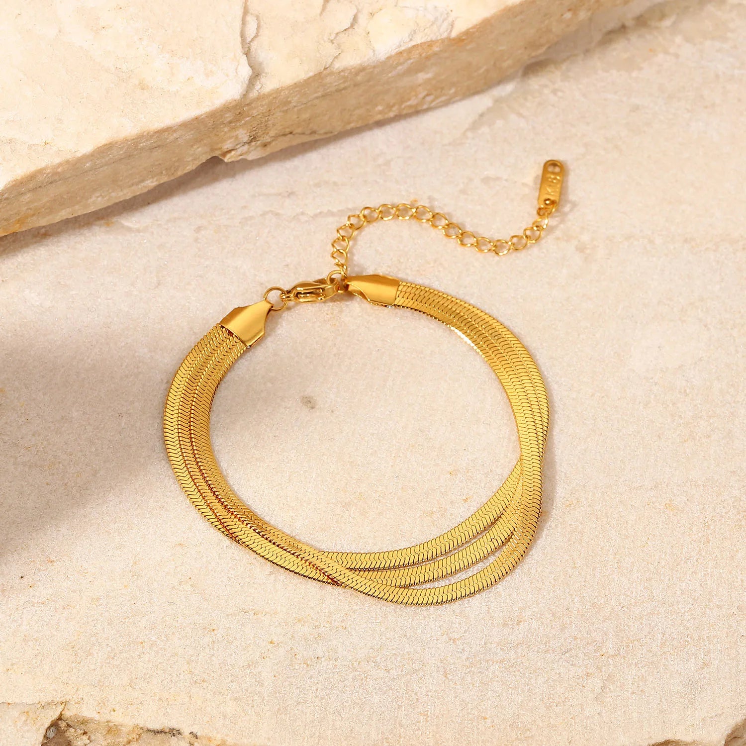 ステンレス304 低ニッケル 水に濡れても錆びにくい 18Kゴールドメッキ ブレスレット 3連 スネークチェーン【YJ01597】