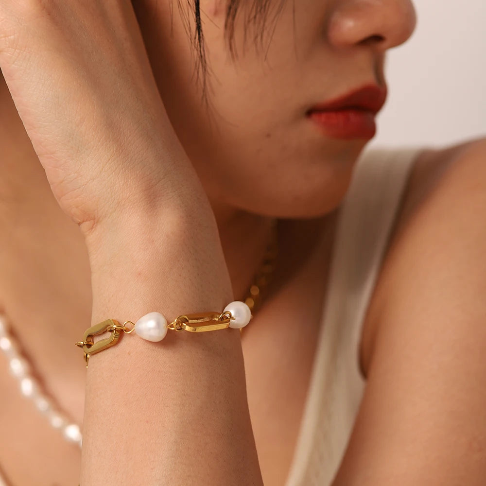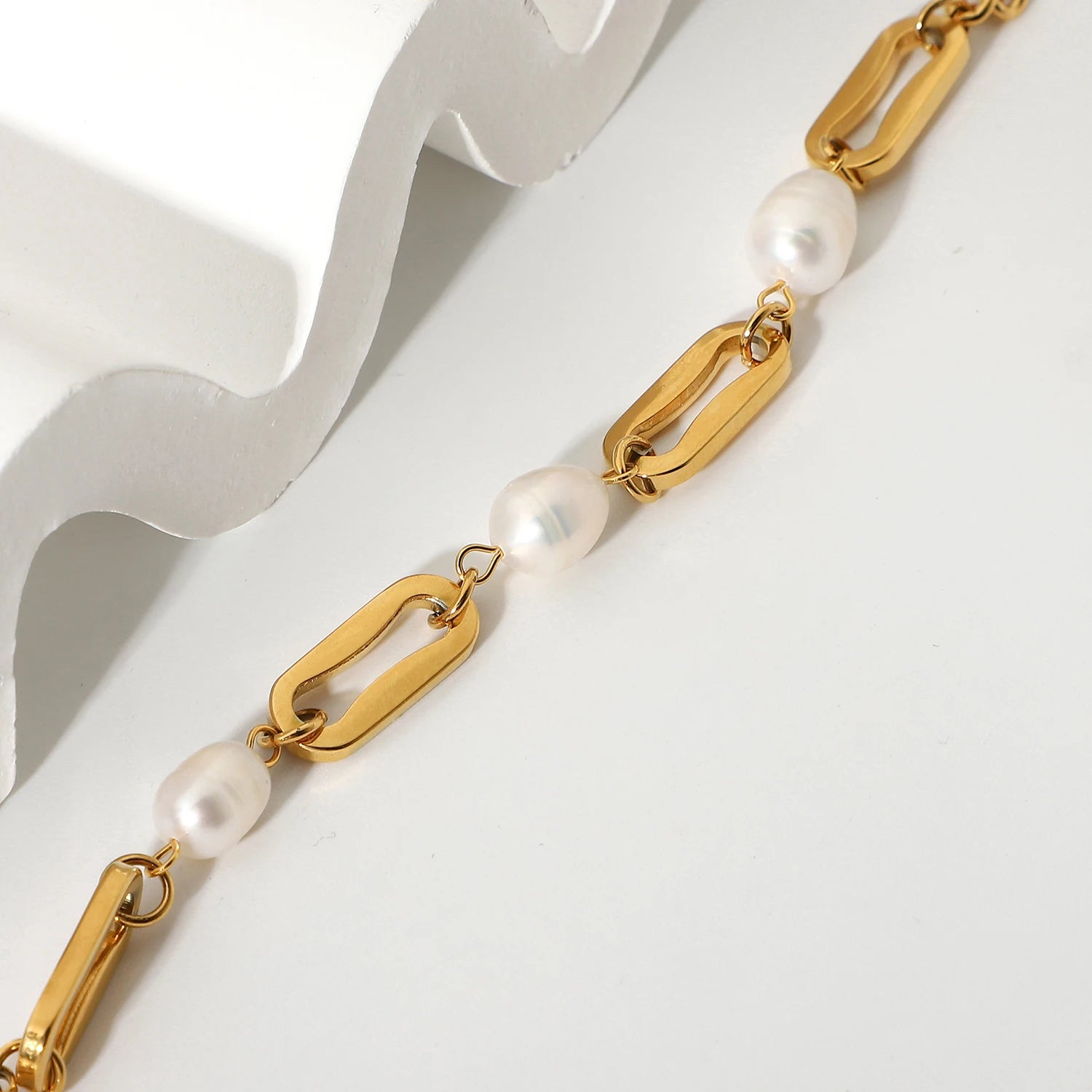 ステンレス304 低ニッケル 水に濡れても錆びにくい 18Kゴールドメッキ ブレスレット チェーン パール 【YJ01760】