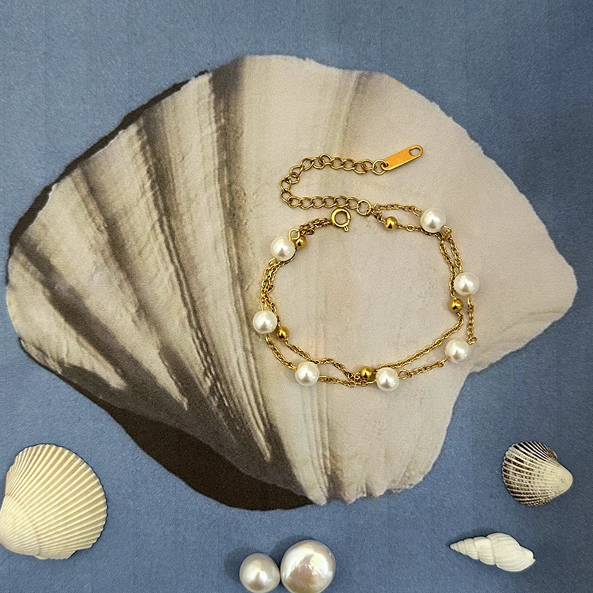 ステンレス304 低ニッケル 水に濡れても錆びにくい 18Kゴールドメッキ ブレスレット 2連 パール 【YJ02853】