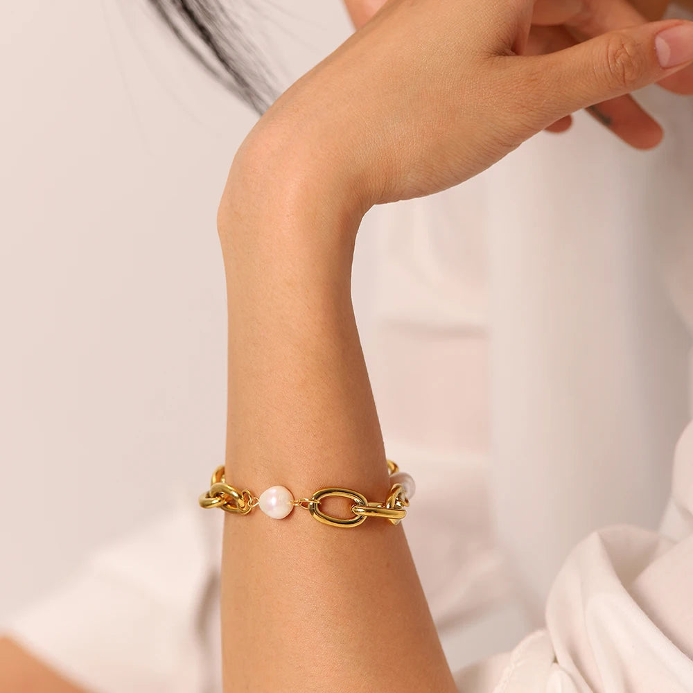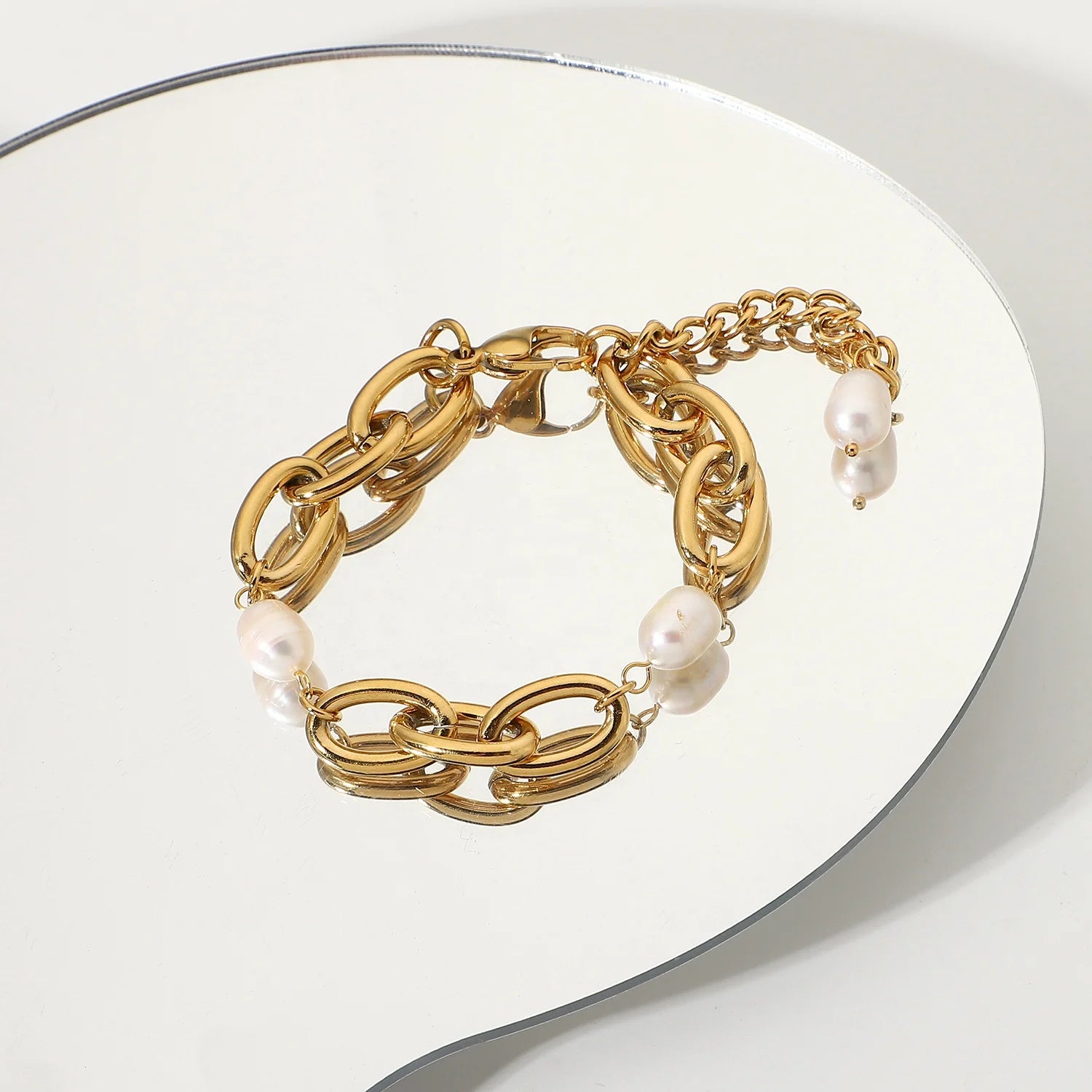 ステンレス304 低ニッケル 水に濡れても錆びにくい 18Kゴールドメッキ ブレスレット パール 【YJ03513】