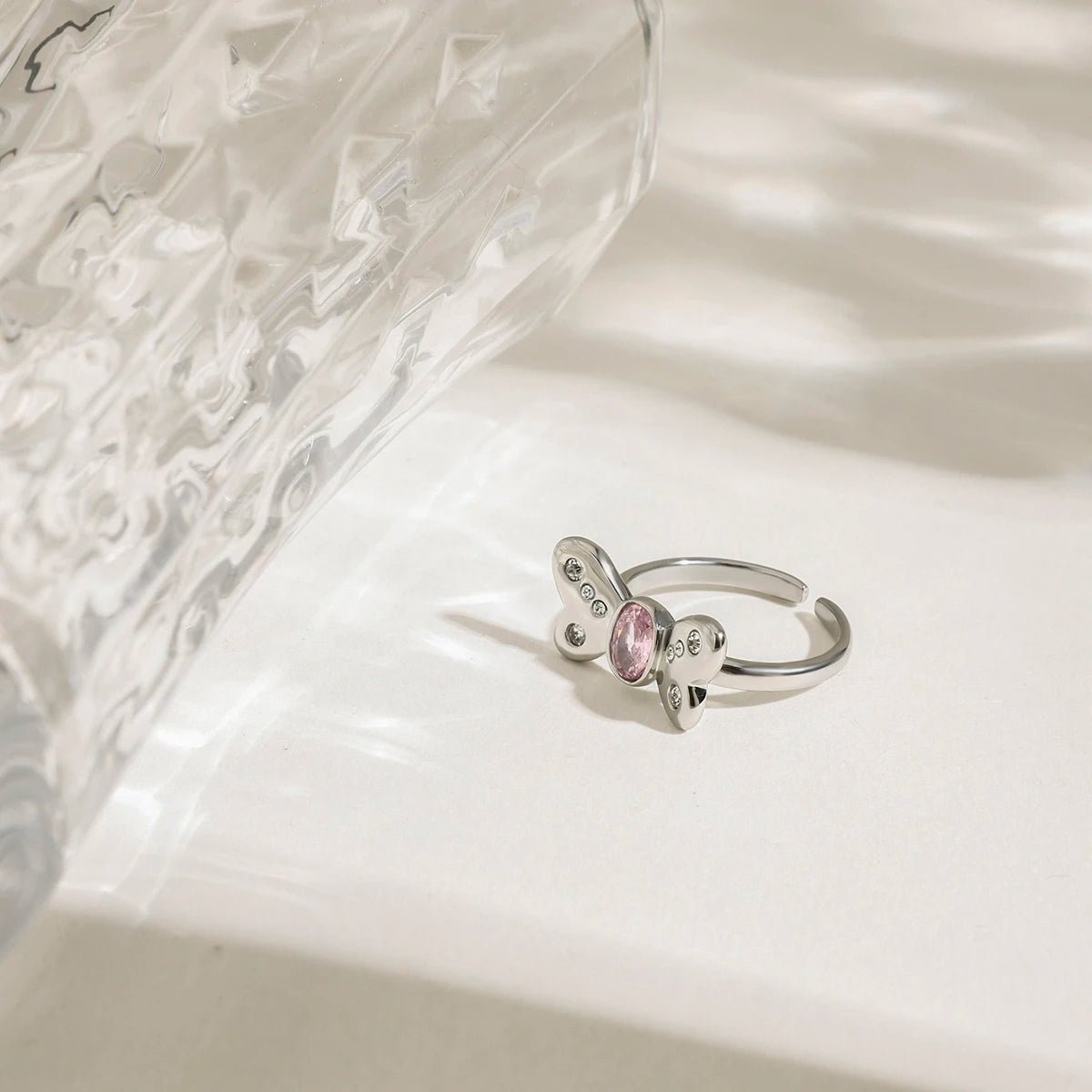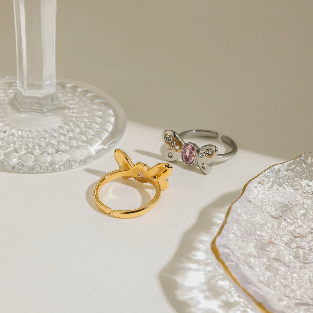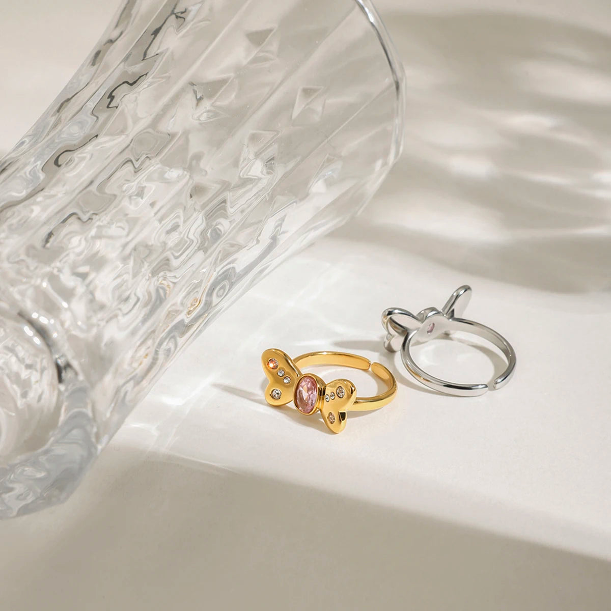 ステンレス304 ニッケルフリー 水に濡れても錆びにくい 18Kゴールドメッキ リング 蝶々 バタフライ ジルコニア 【YJ00919】