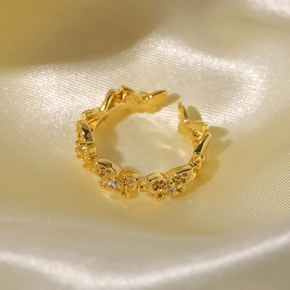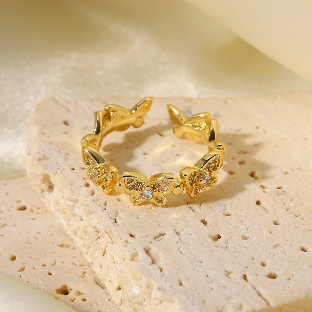 ステンレス304 低ニッケル 水に濡れても錆びにくい 18Kゴールドメッキ リング 蝶々 バタフライ ジルコニア 【YJ03098】