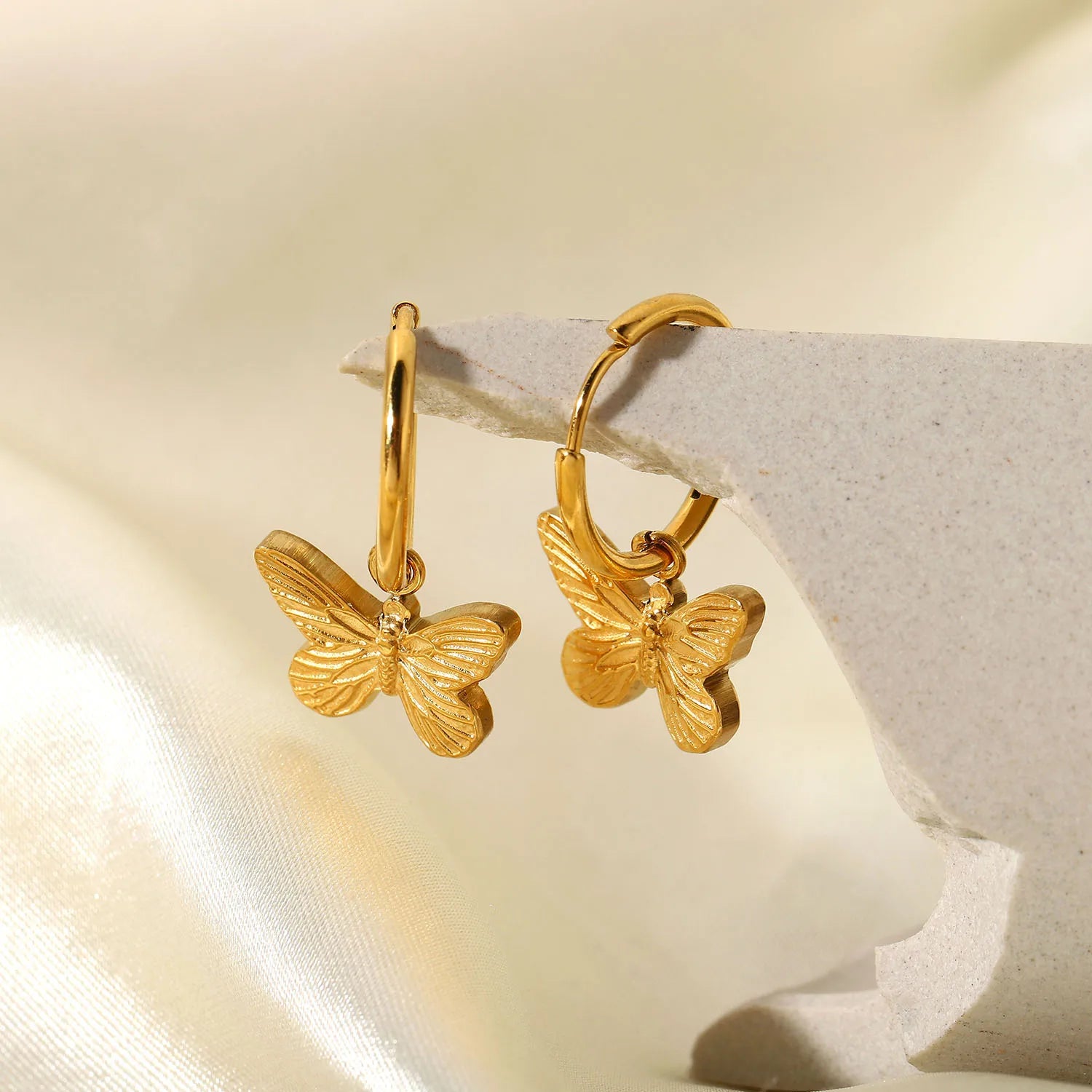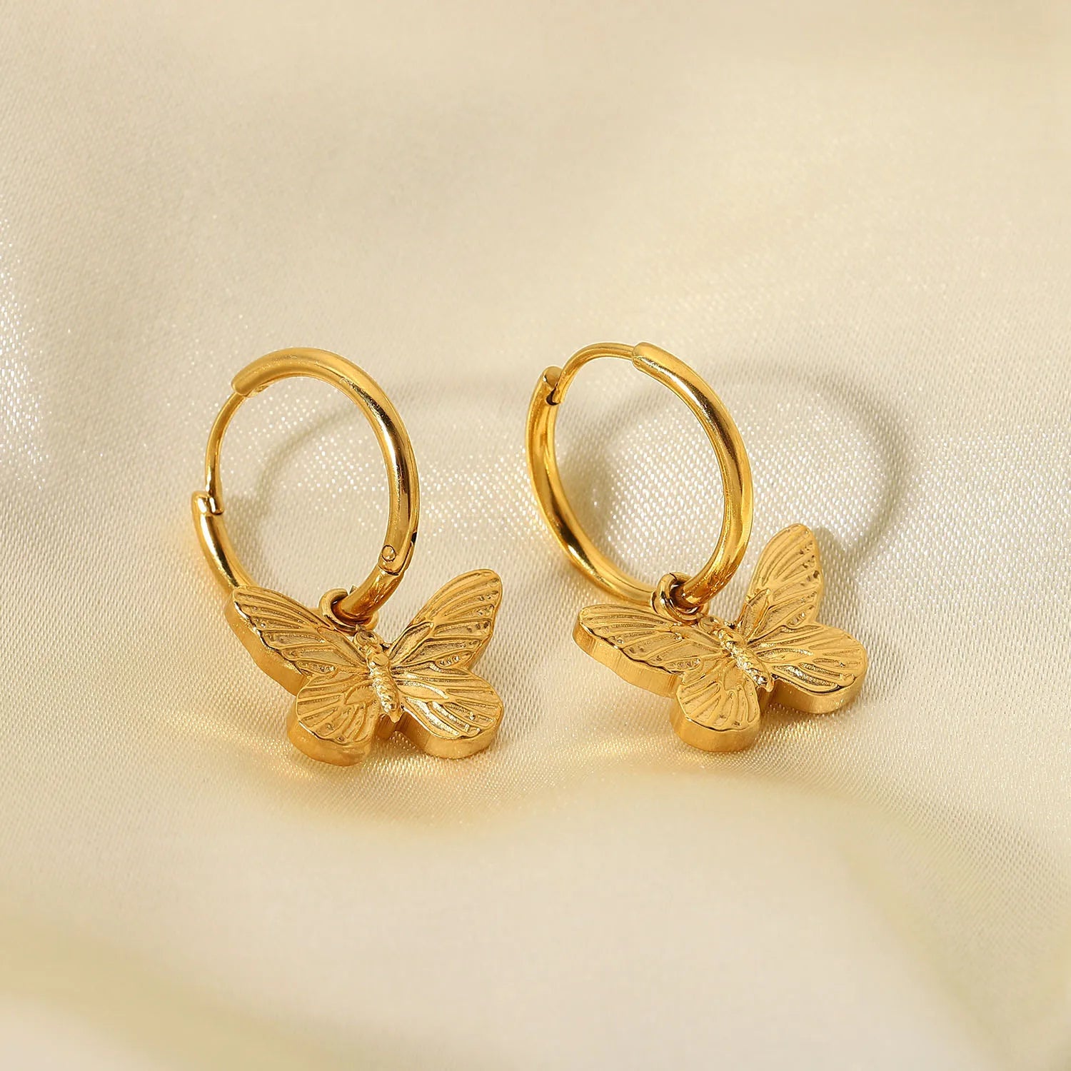 ステンレス304 低ニッケル 水に濡れても錆びにくい 18Kゴールドメッキ ピアス フープ 蝶々 バタフライ 【YJ03482】