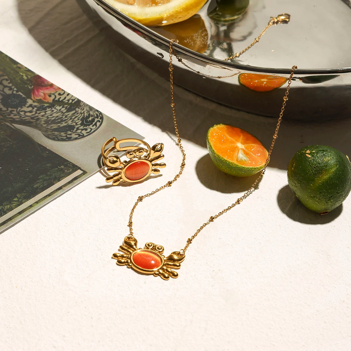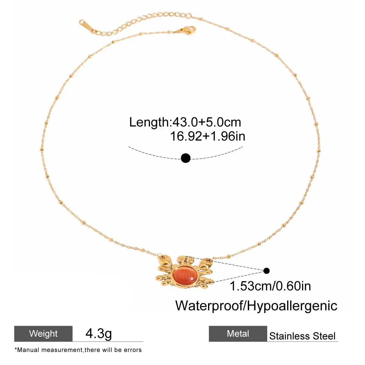 ステンレス304 ニッケルフリー 水に濡れても錆びにくい 18Kゴールドメッキ チェーン チャーム ネックレス カニ【YJ00423】