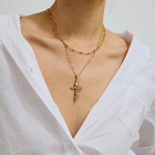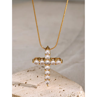 ステンレス304 低ニッケル 水に濡れても錆びにくい 18Kゴールドメッキ ネックレス クロスパール ジルコニア 【YJ02765】
