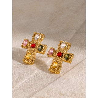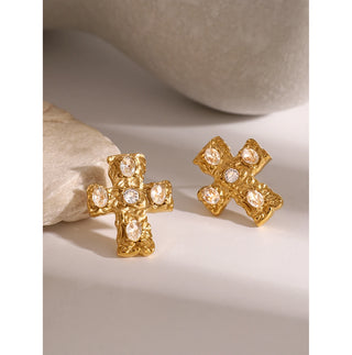 ステンレス304 低ニッケル 水に濡れても錆びにくい 18Kゴールドメッキ ピアス クロス ジルコニア 【YJ03833】