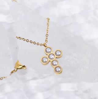 ステンレス304 低ニッケル 水に濡れても錆びにくい 18Kゴールドメッキ ネックレス クロス パール 【YJ03352】