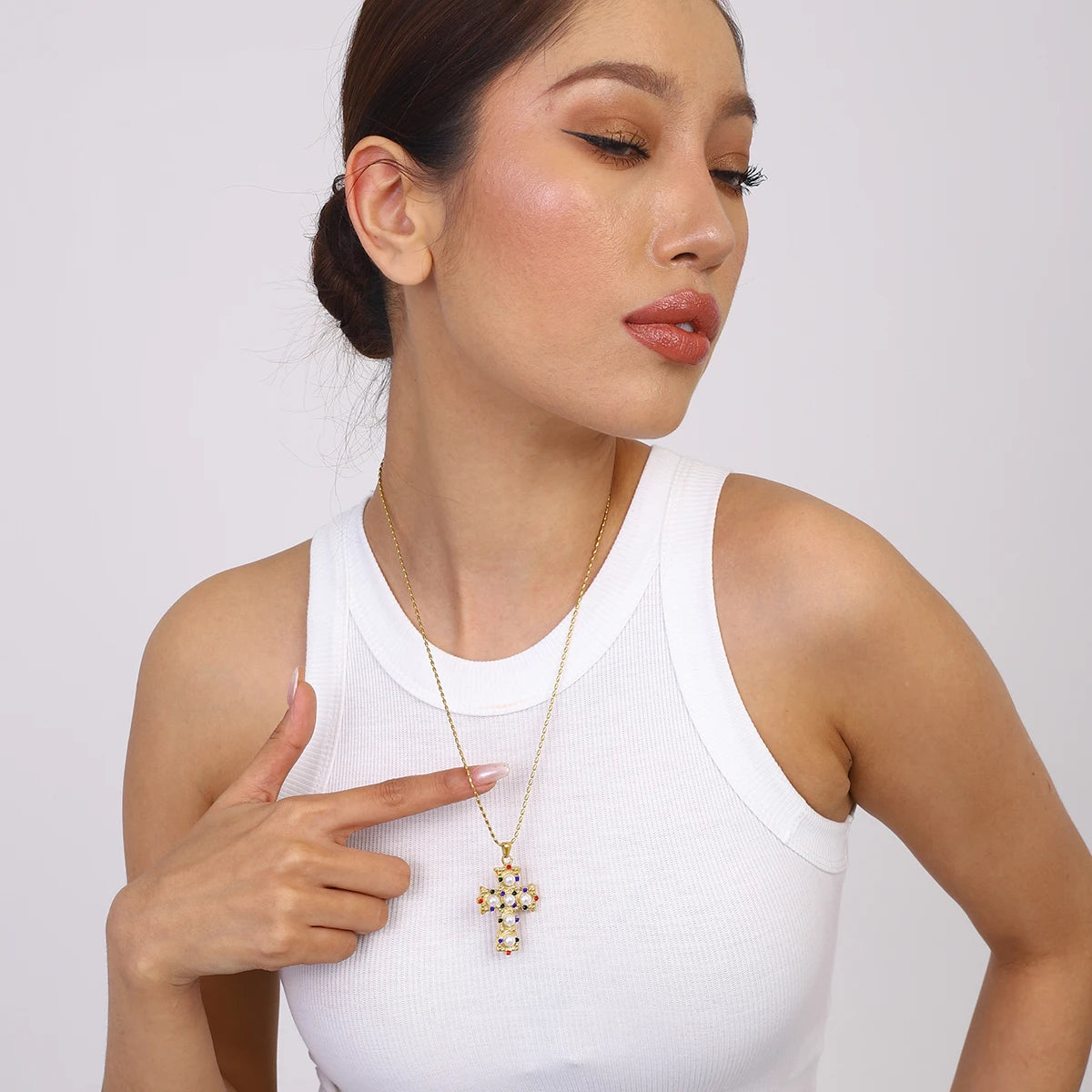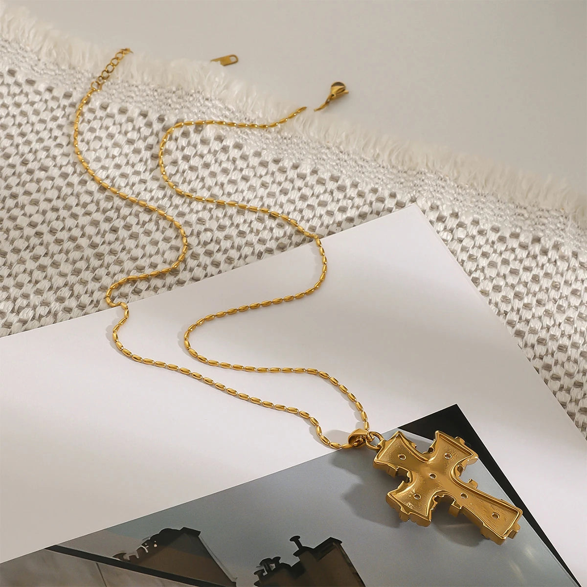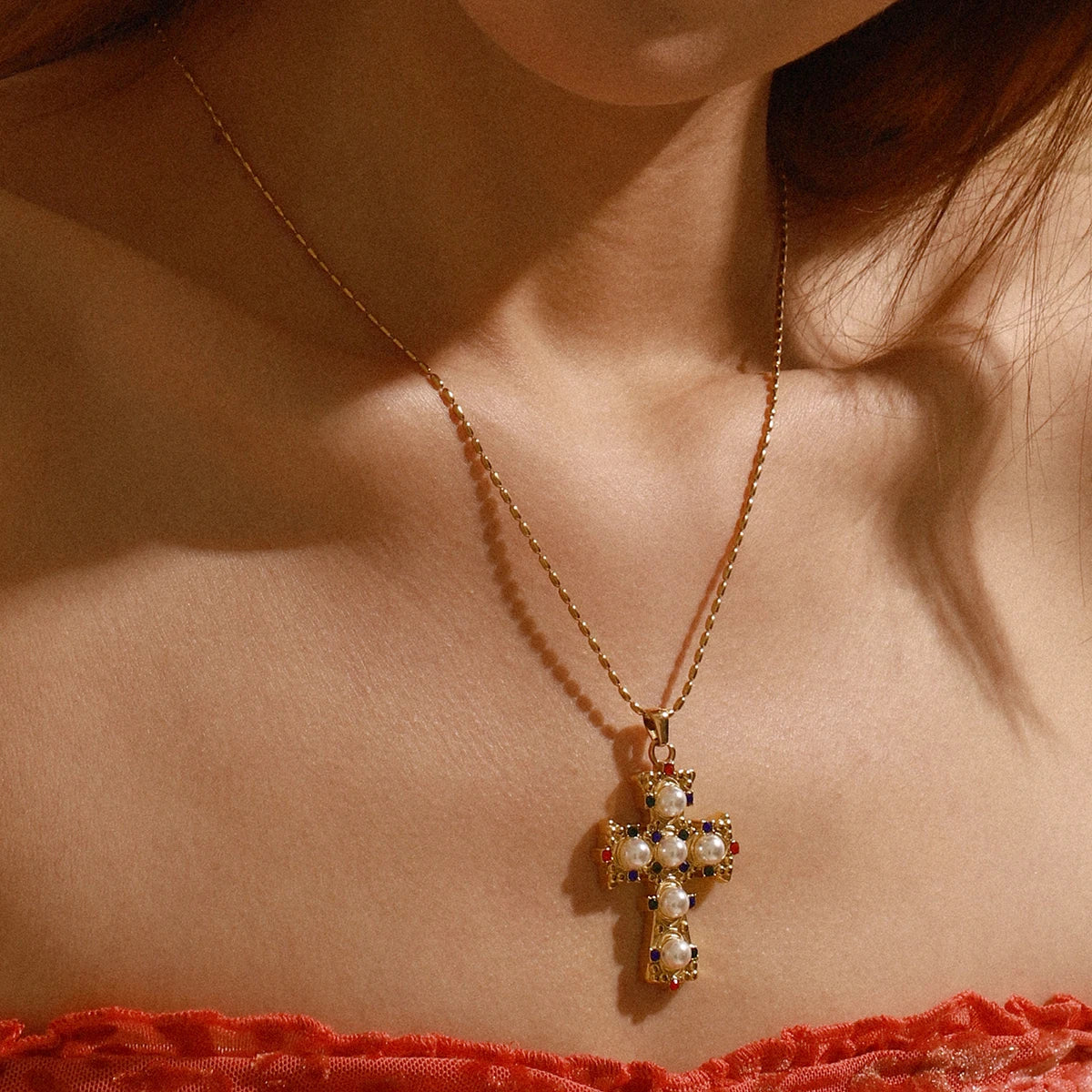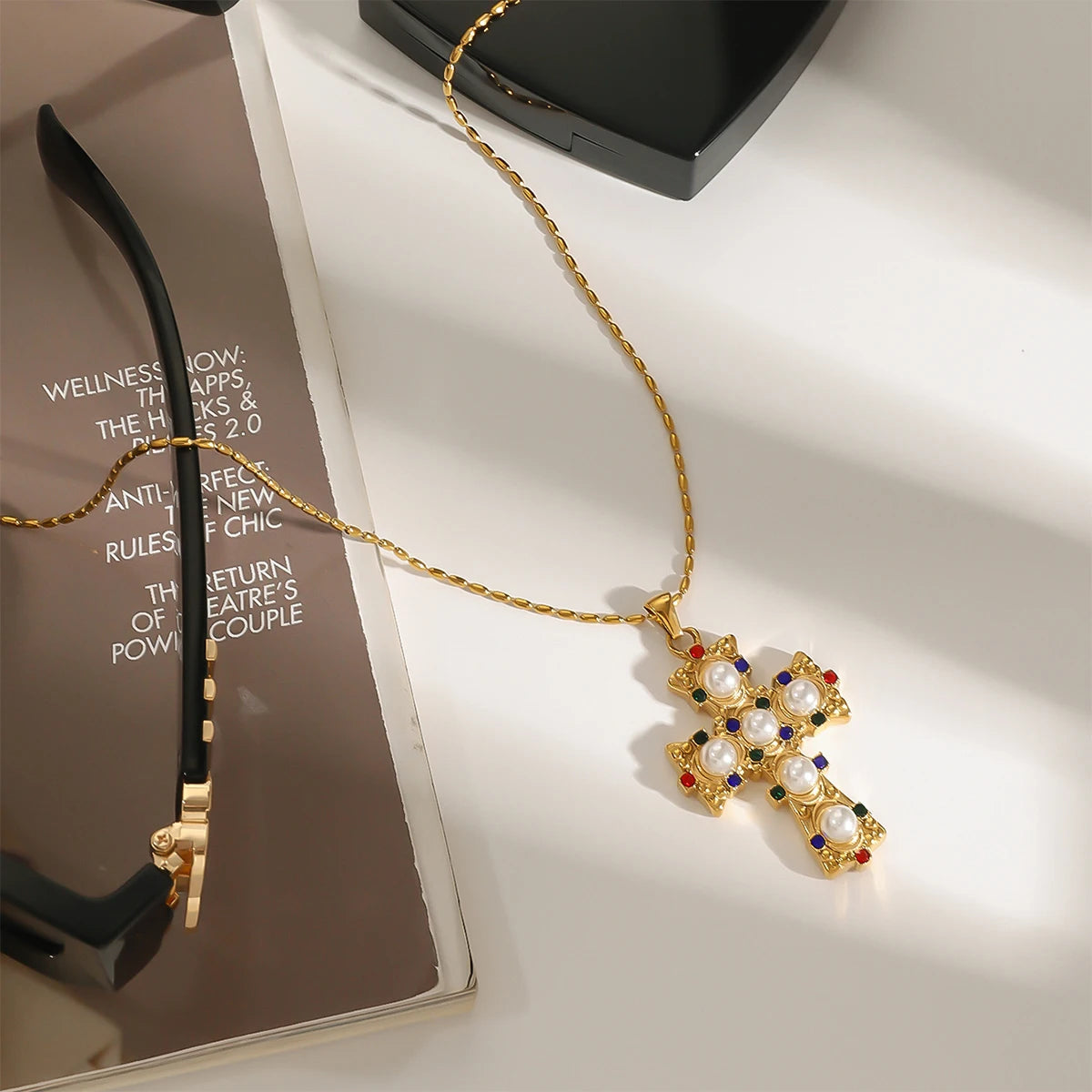 ステンレス304 低ニッケル 水に濡れても錆びにくい 18Kゴールドメッキ ネックレス クロス パール 【YJ01670】