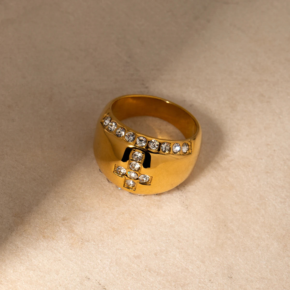 ステンレス304 低ニッケル 水に濡れても錆びにくい 18Kゴールドメッキ リング チャンキー クロス ジルコニア 【YJ02223】