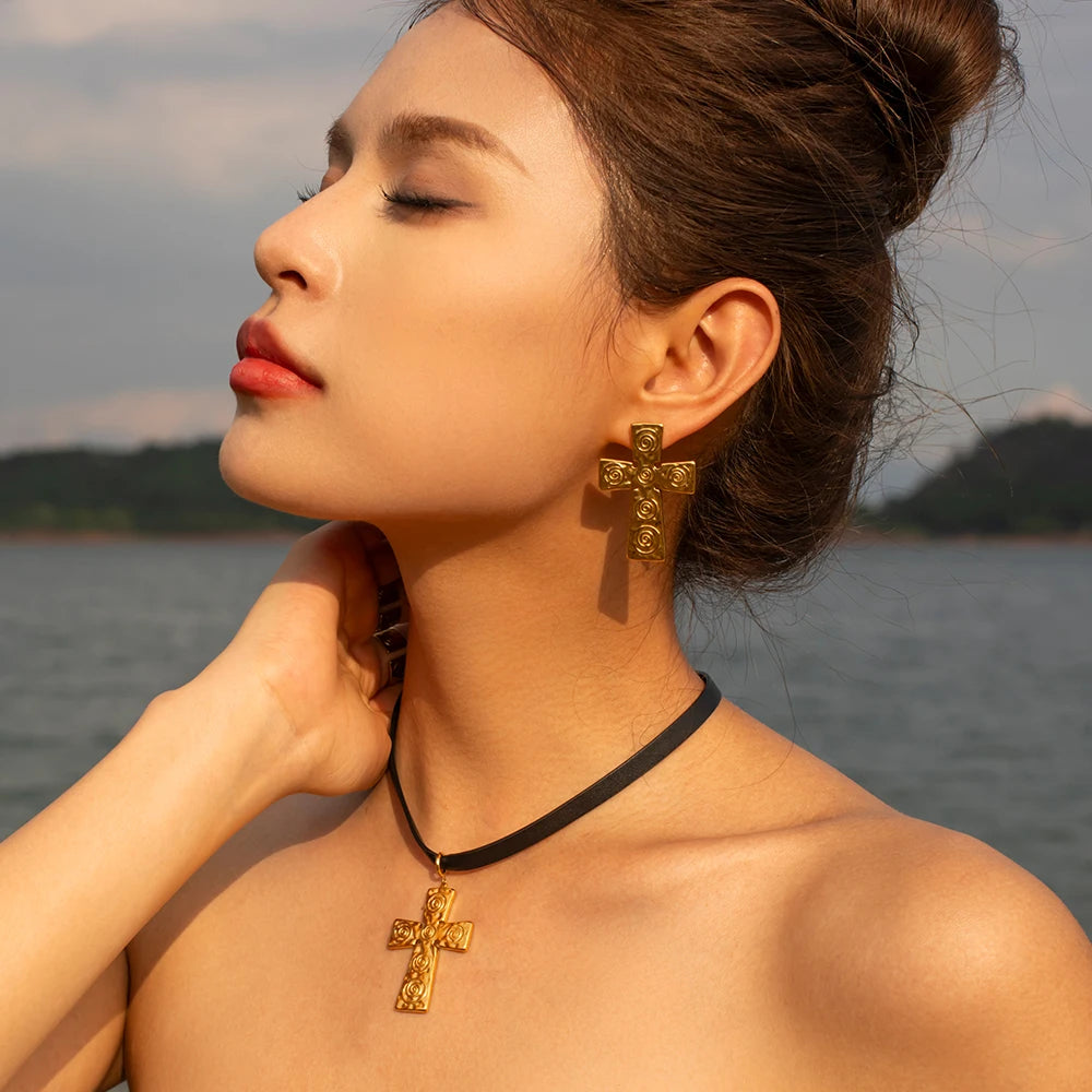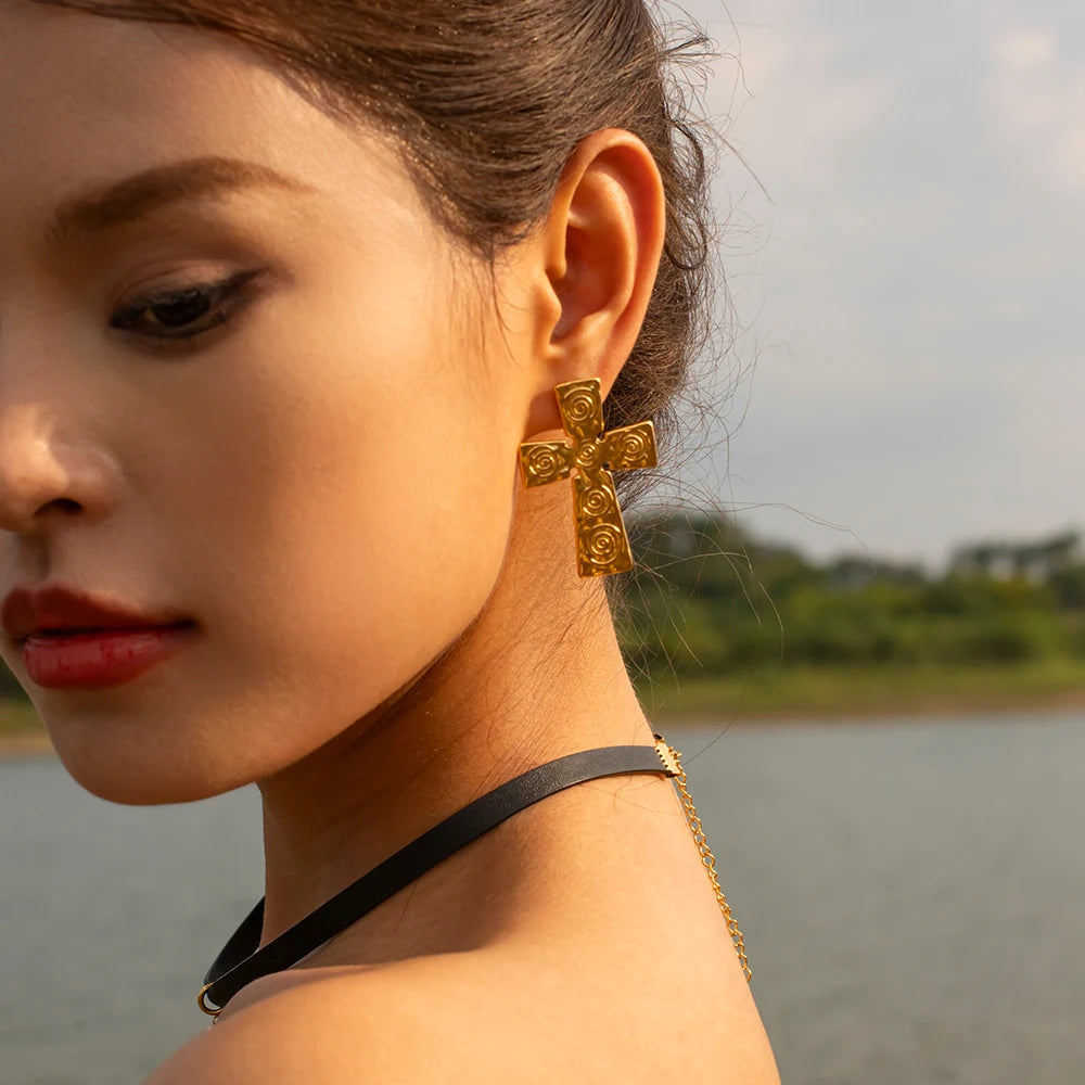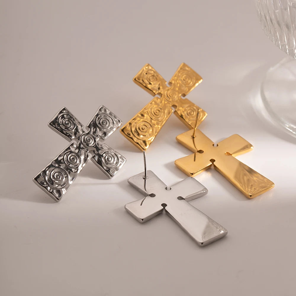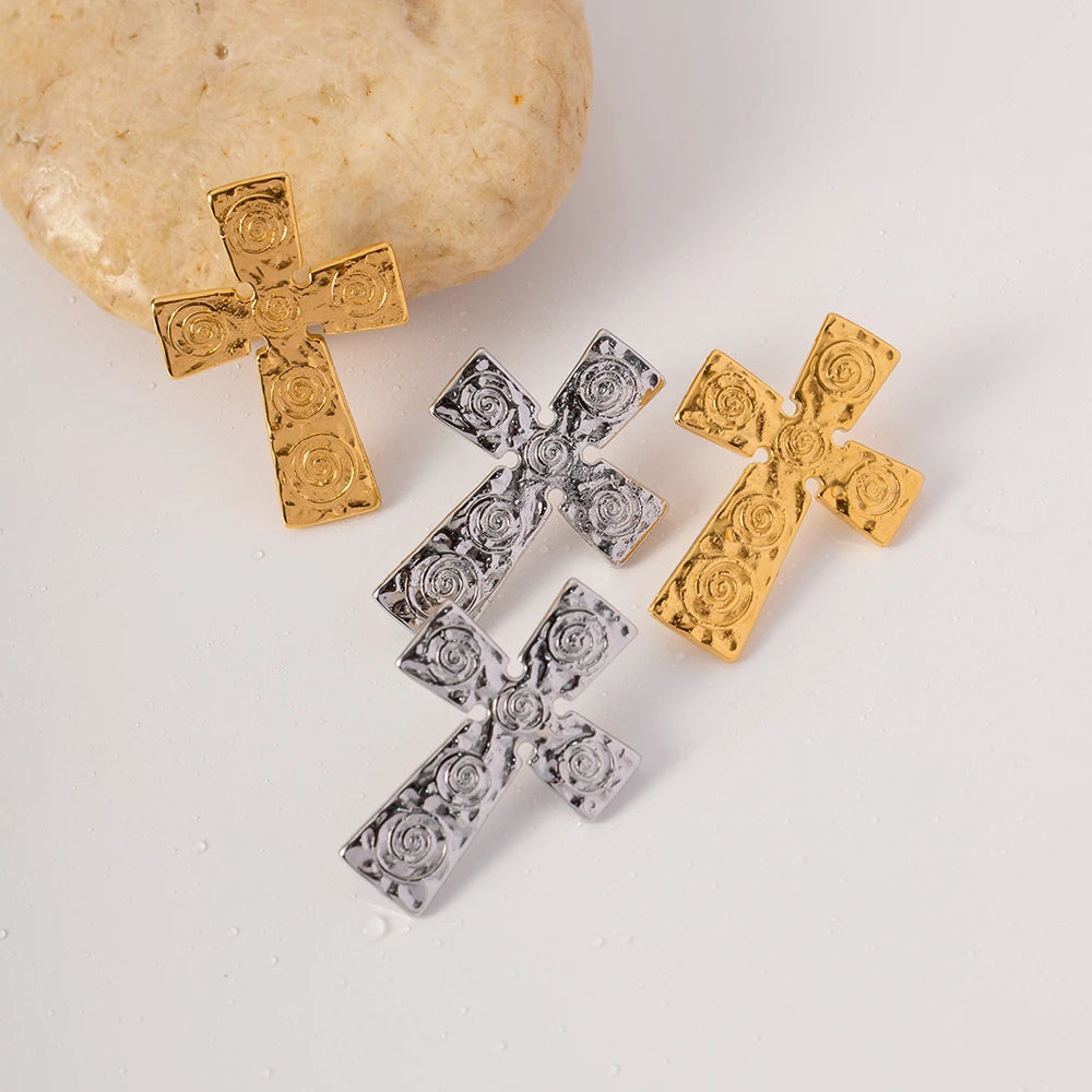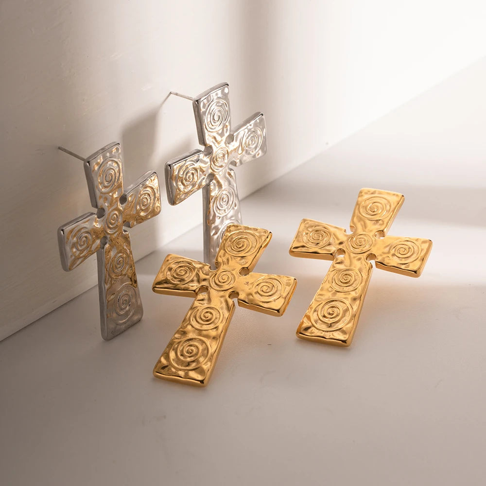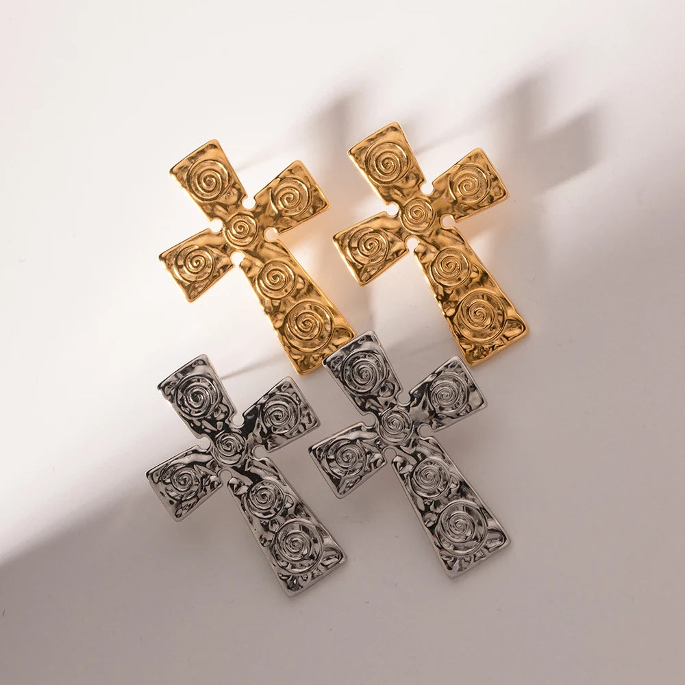 ステンレス304 低ニッケル 水に濡れても錆びにくい 18Kゴールドメッキ ピアス スパイラル クロス 【YJ02321】