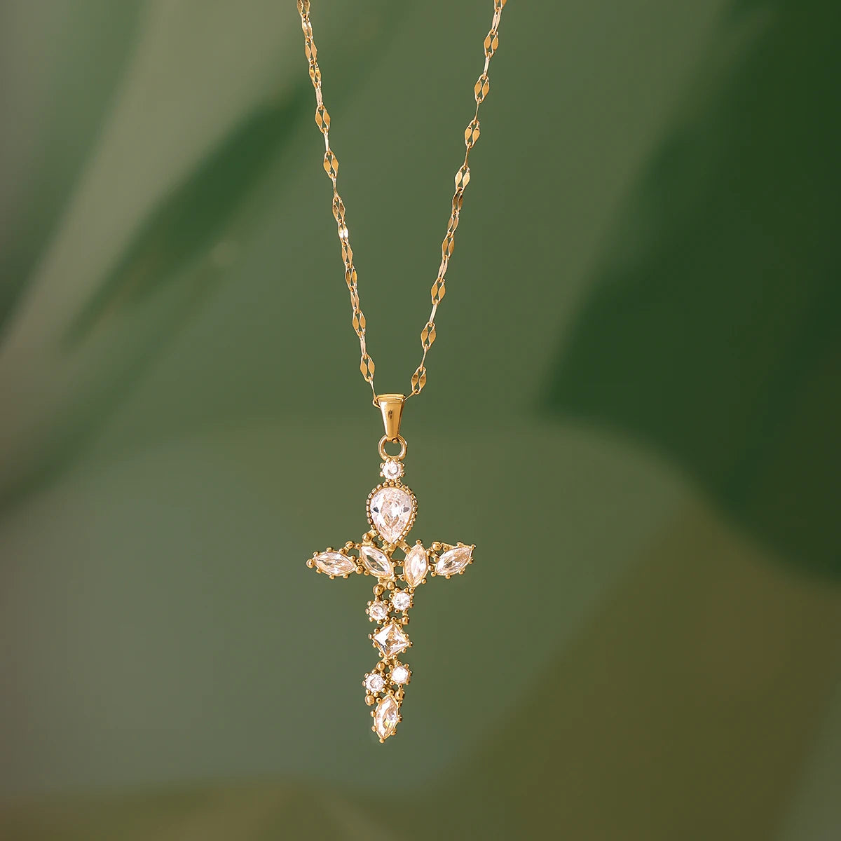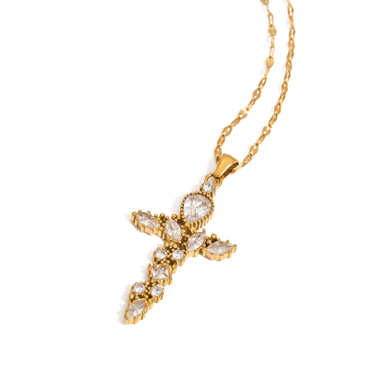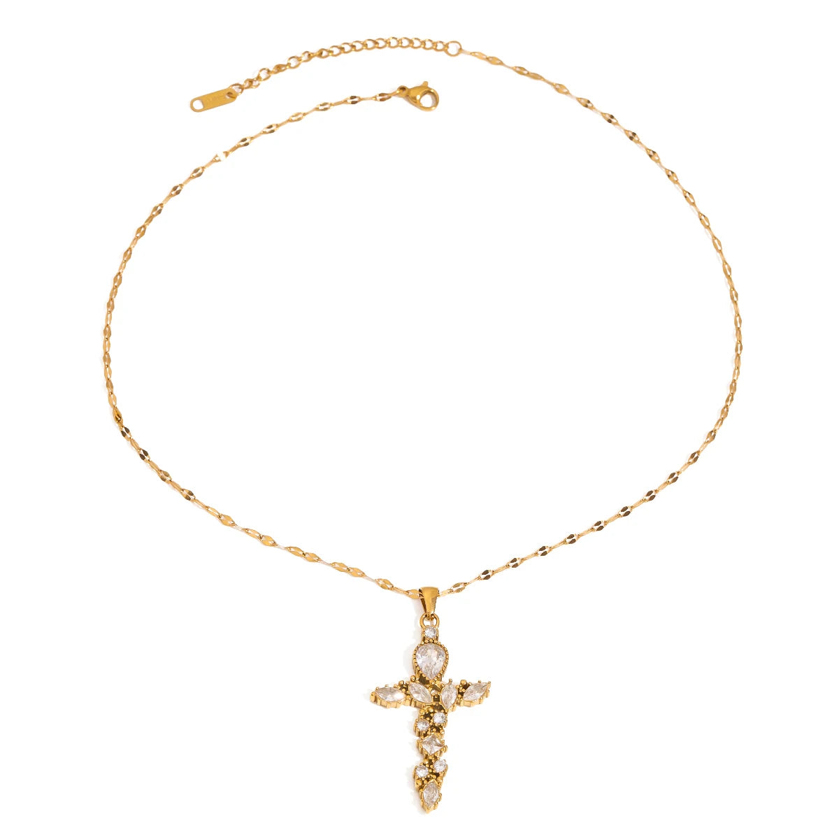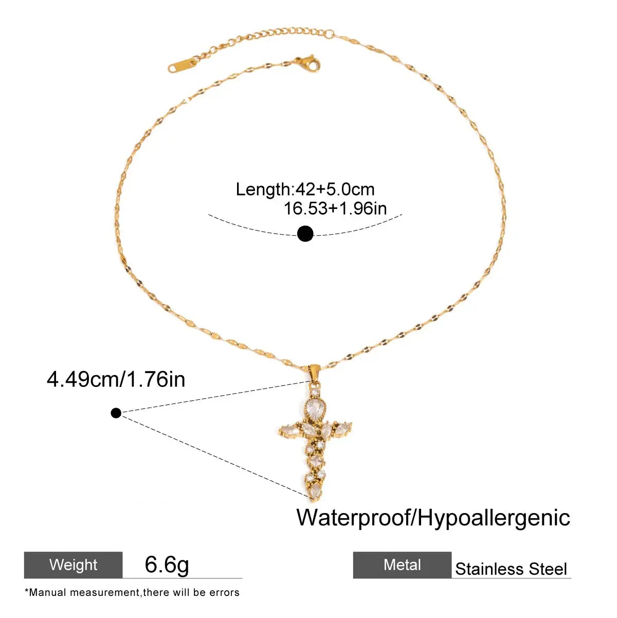 ステンレス304 低ニッケル 水に濡れても錆びにくい 18Kゴールドメッキ ネックレス クロス ジルコニア 【YJ02452】