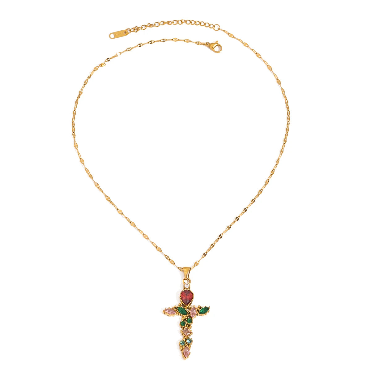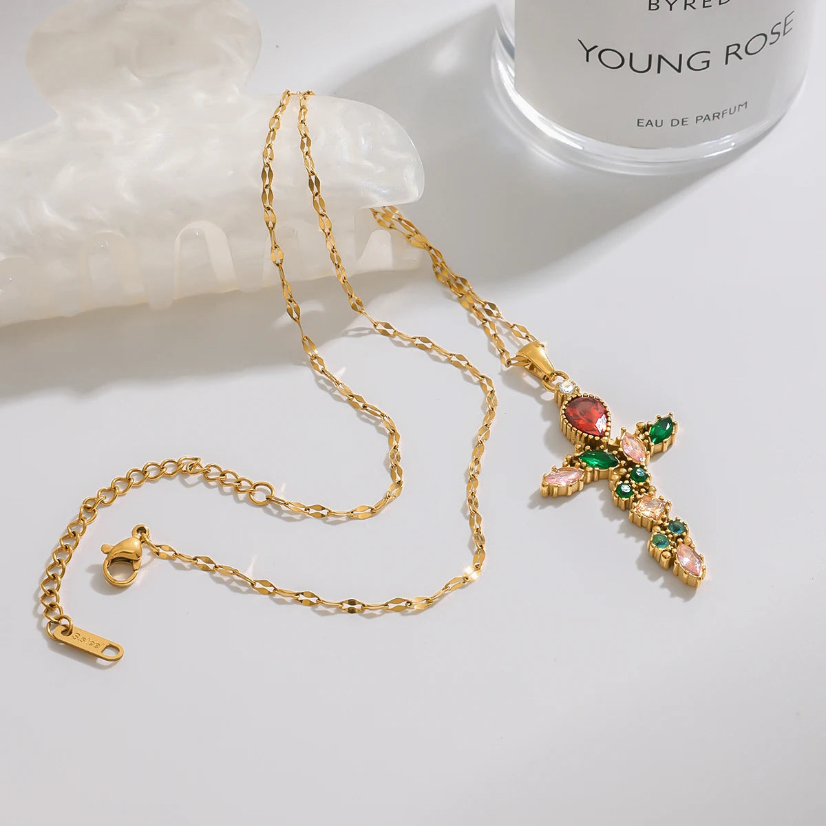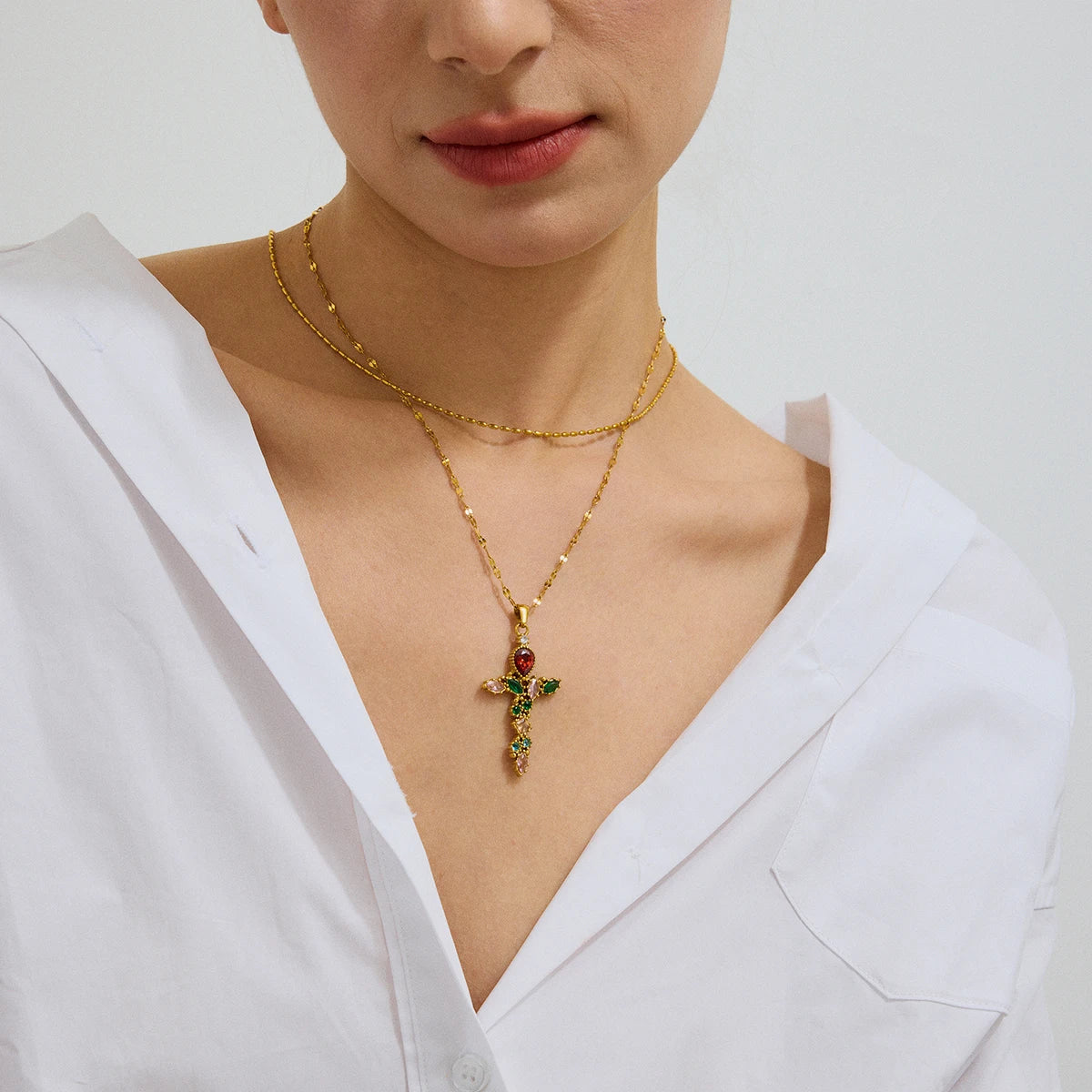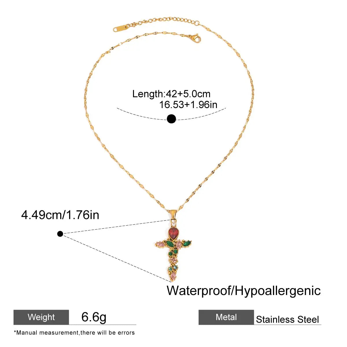 ステンレス304 低ニッケル 水に濡れても錆びにくい 18Kゴールドメッキ ネックレス クロス ジルコニア 【YJ02453】