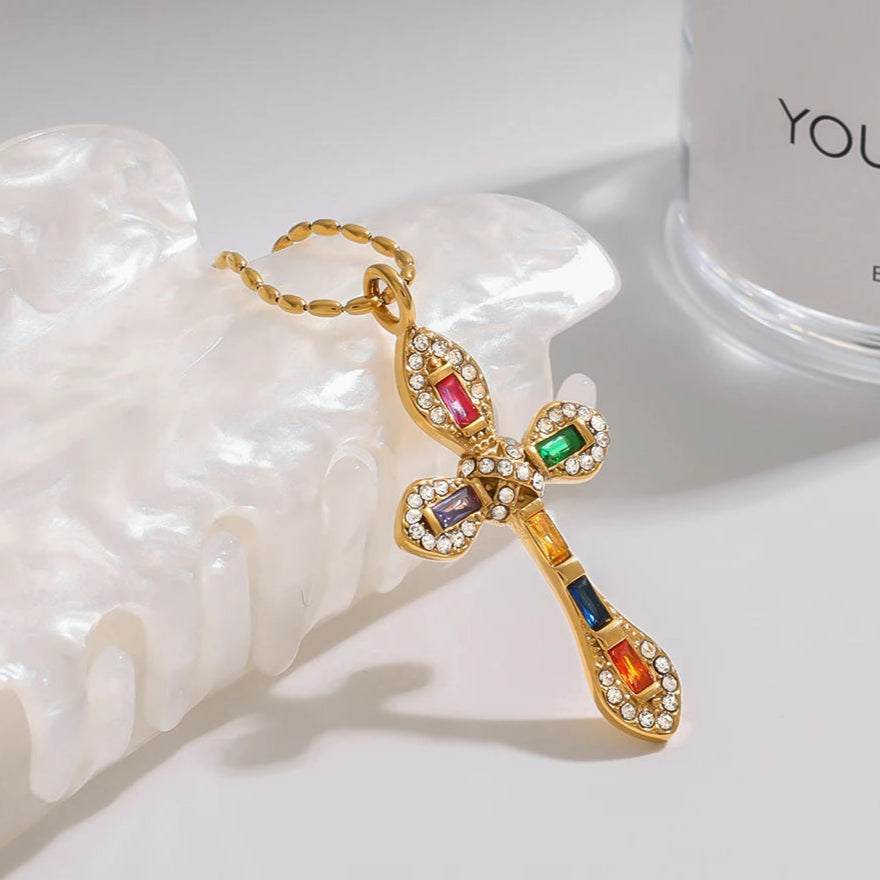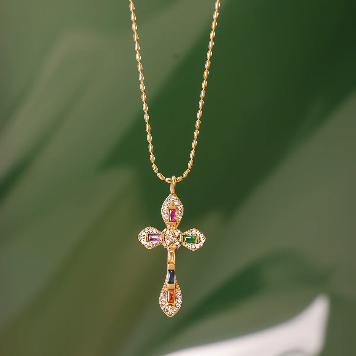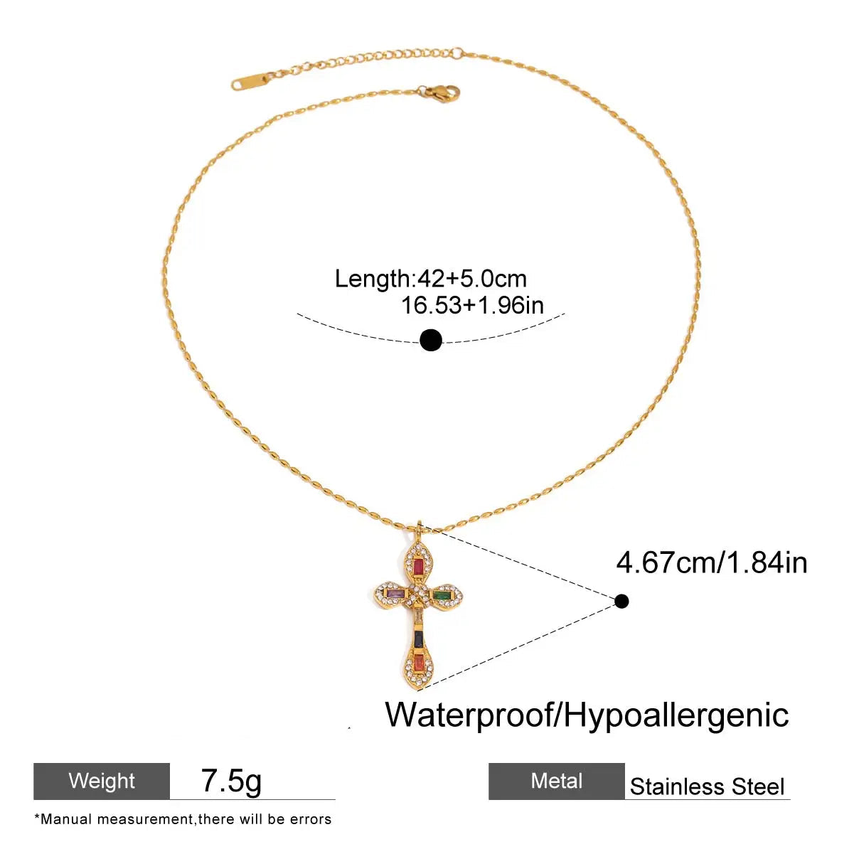 ステンレス304 低ニッケル 水に濡れても錆びにくい 18Kゴールドメッキ ネックレス クロス ジルコニア【YJ02456】