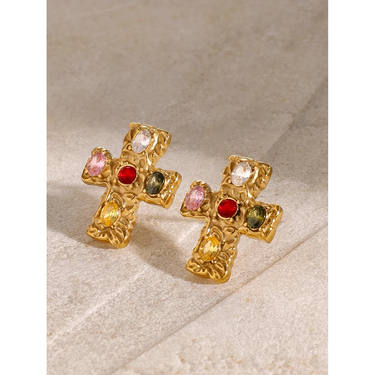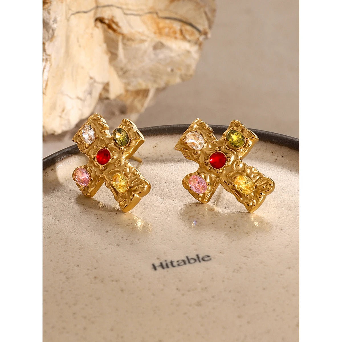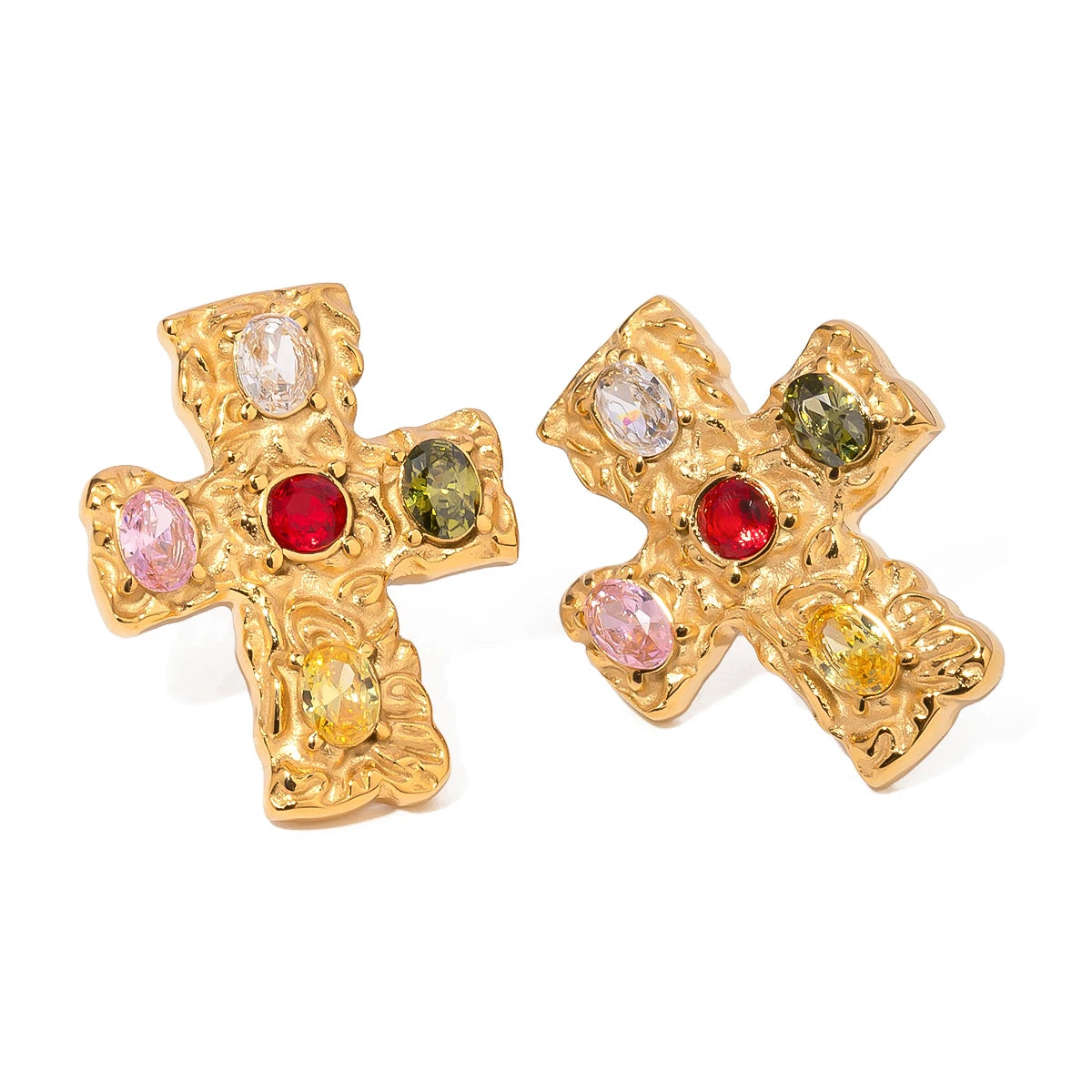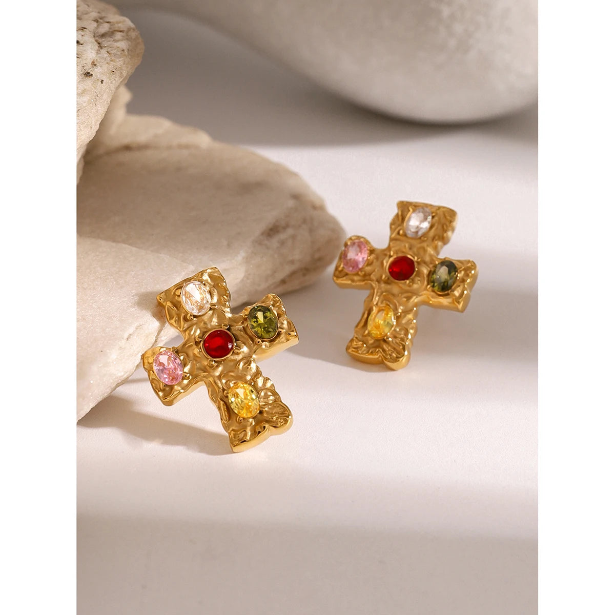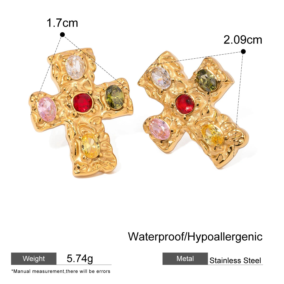 ステンレス304 低ニッケル 水に濡れても錆びにくい 18Kゴールドメッキ ピアス クロス ジルコニア 【YJ02671】