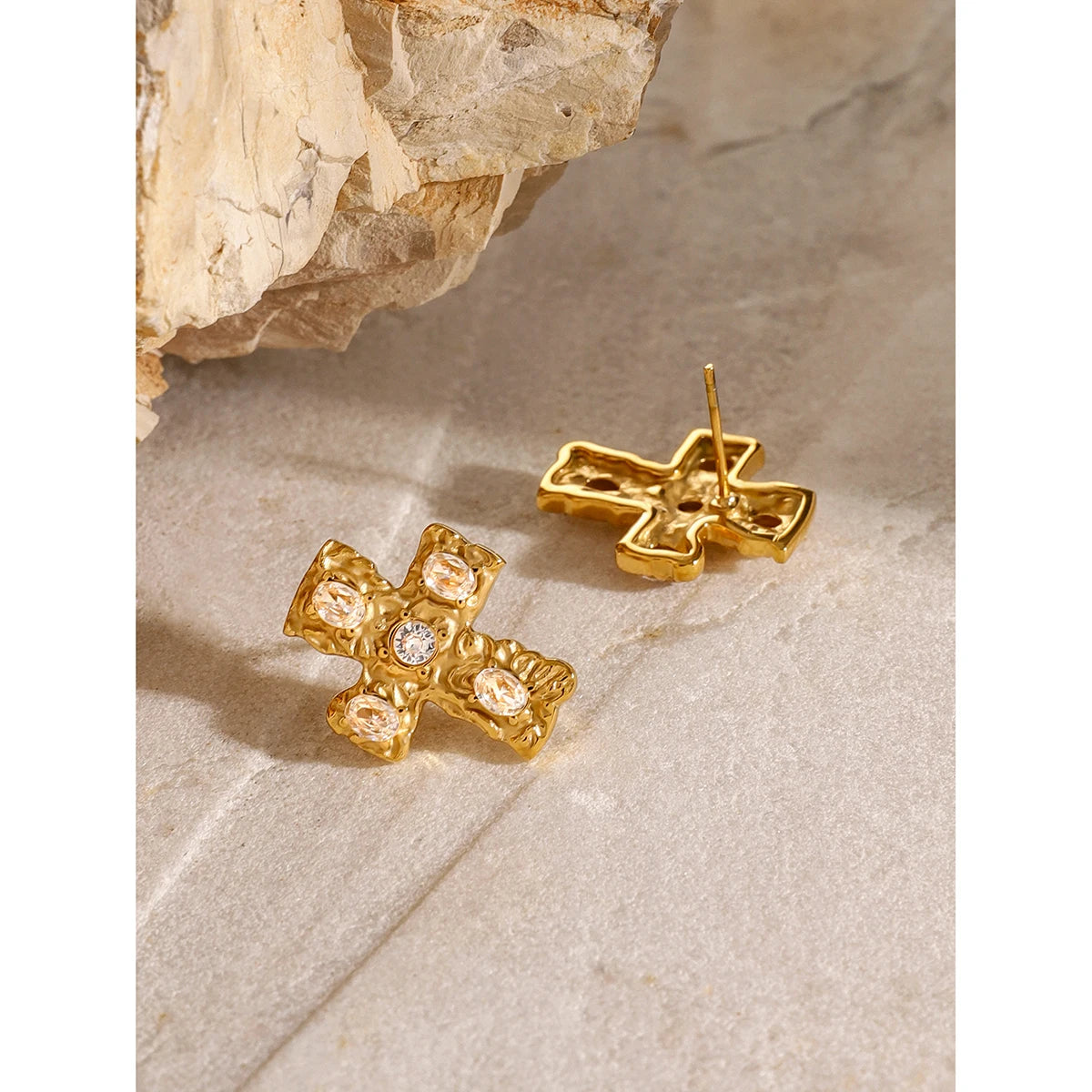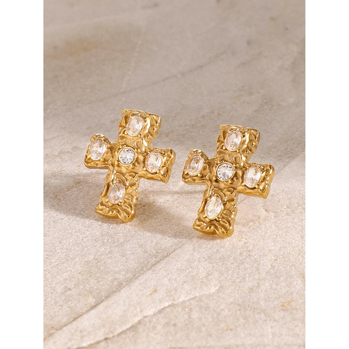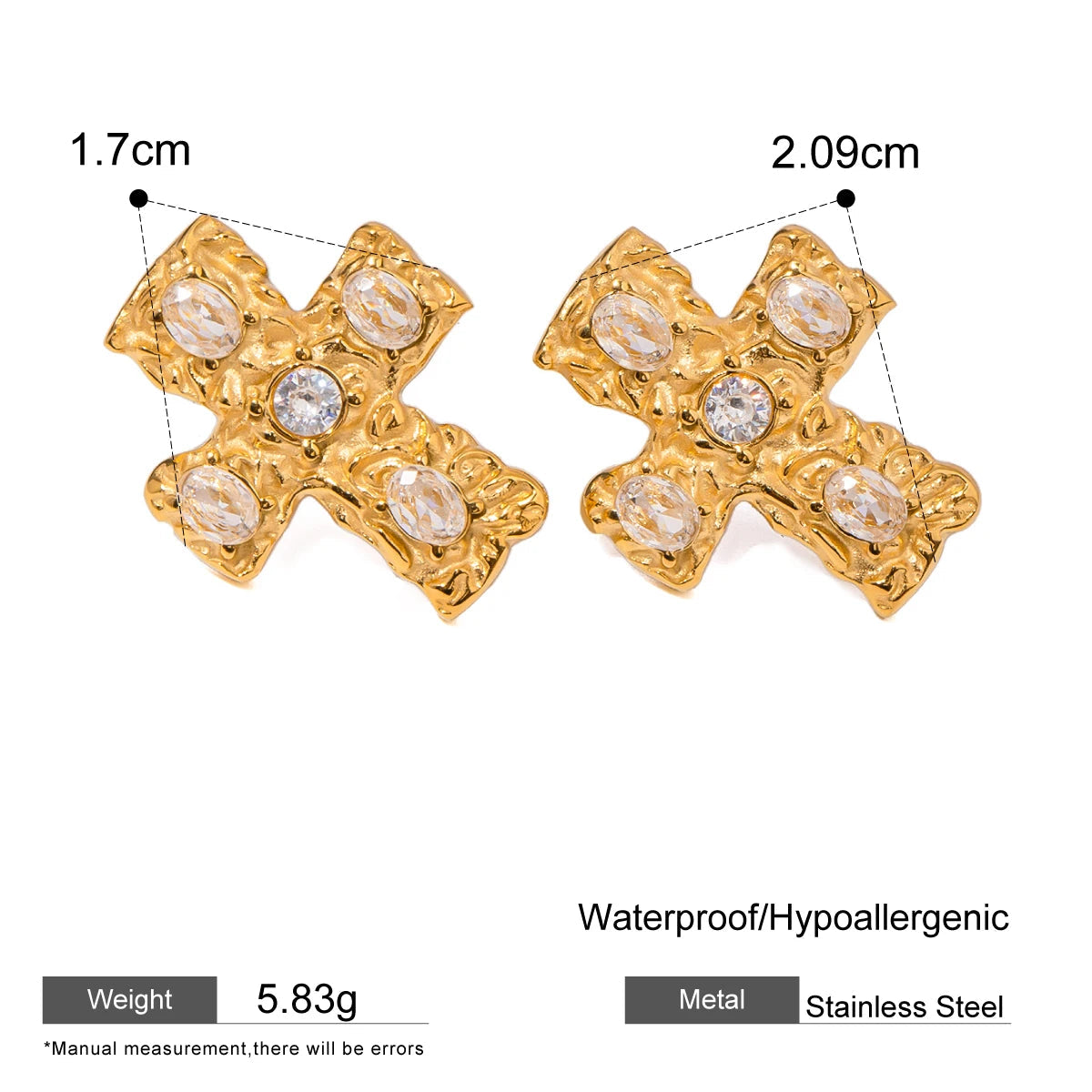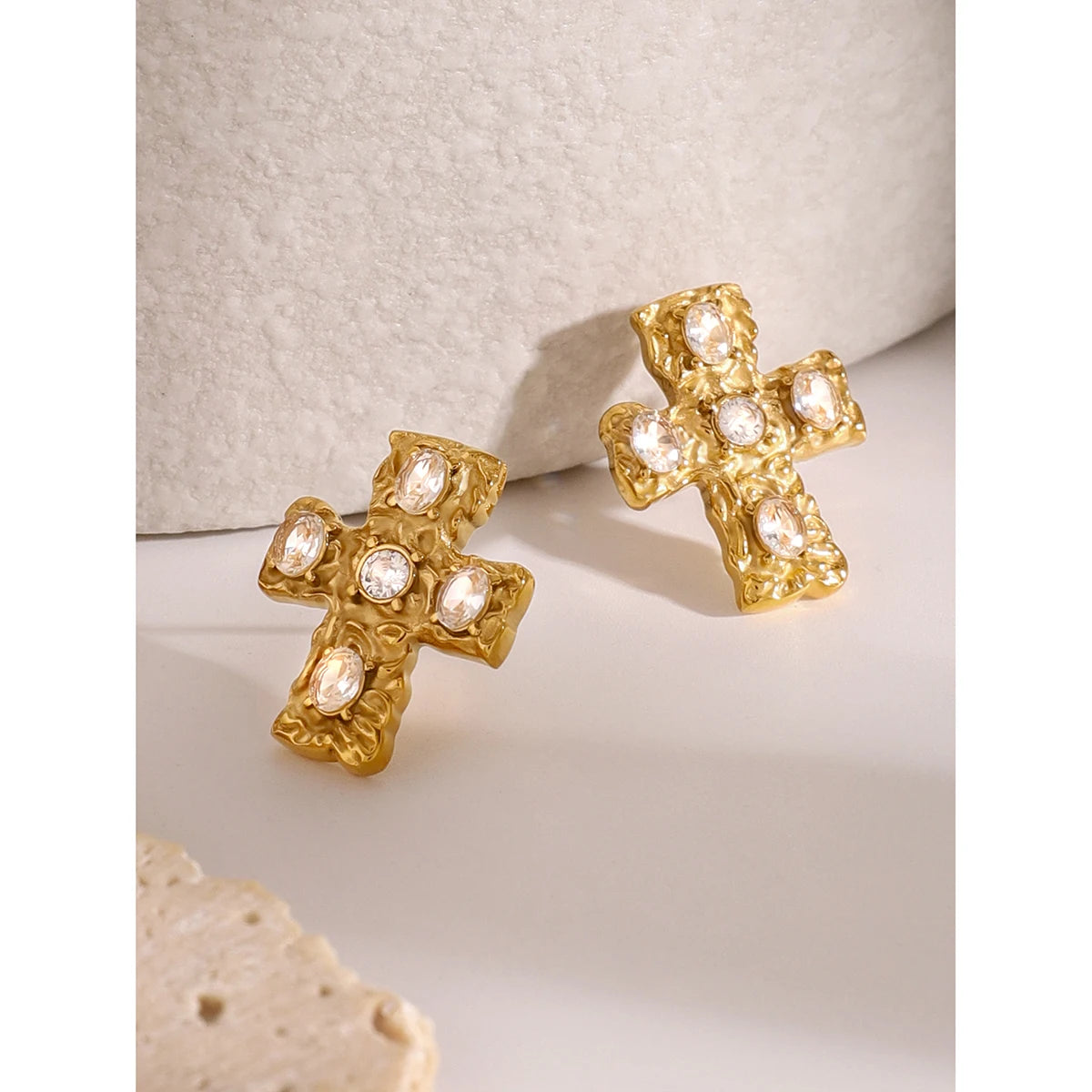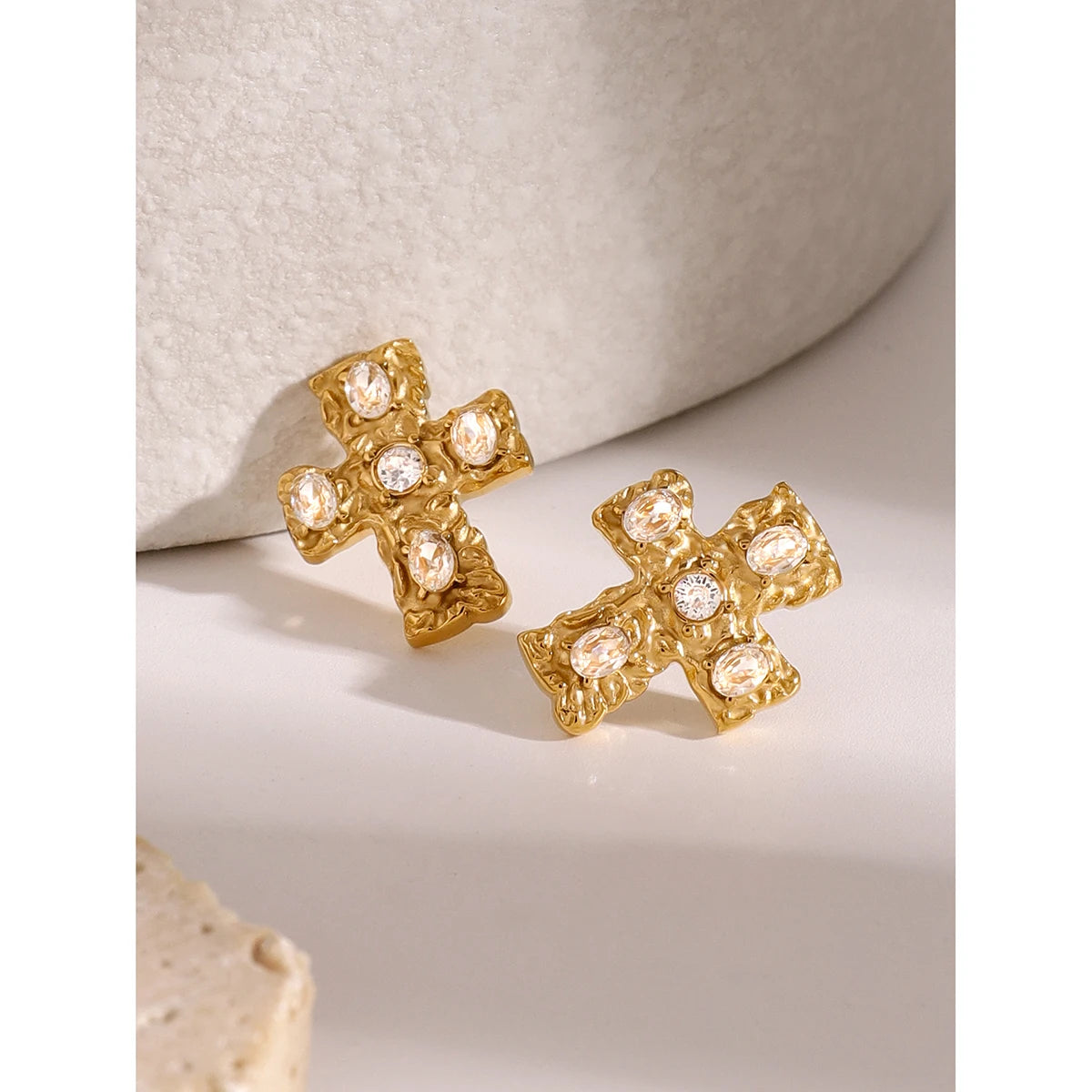 ステンレス304 低ニッケル 水に濡れても錆びにくい 18Kゴールドメッキ ピアス クロス ジルコニア 【YJ02686】