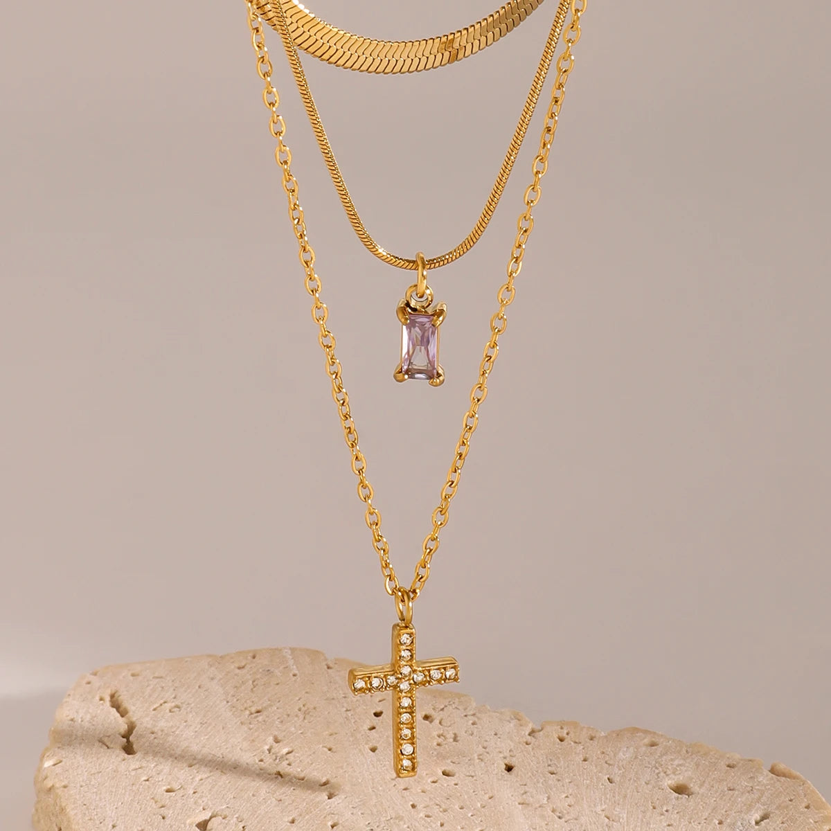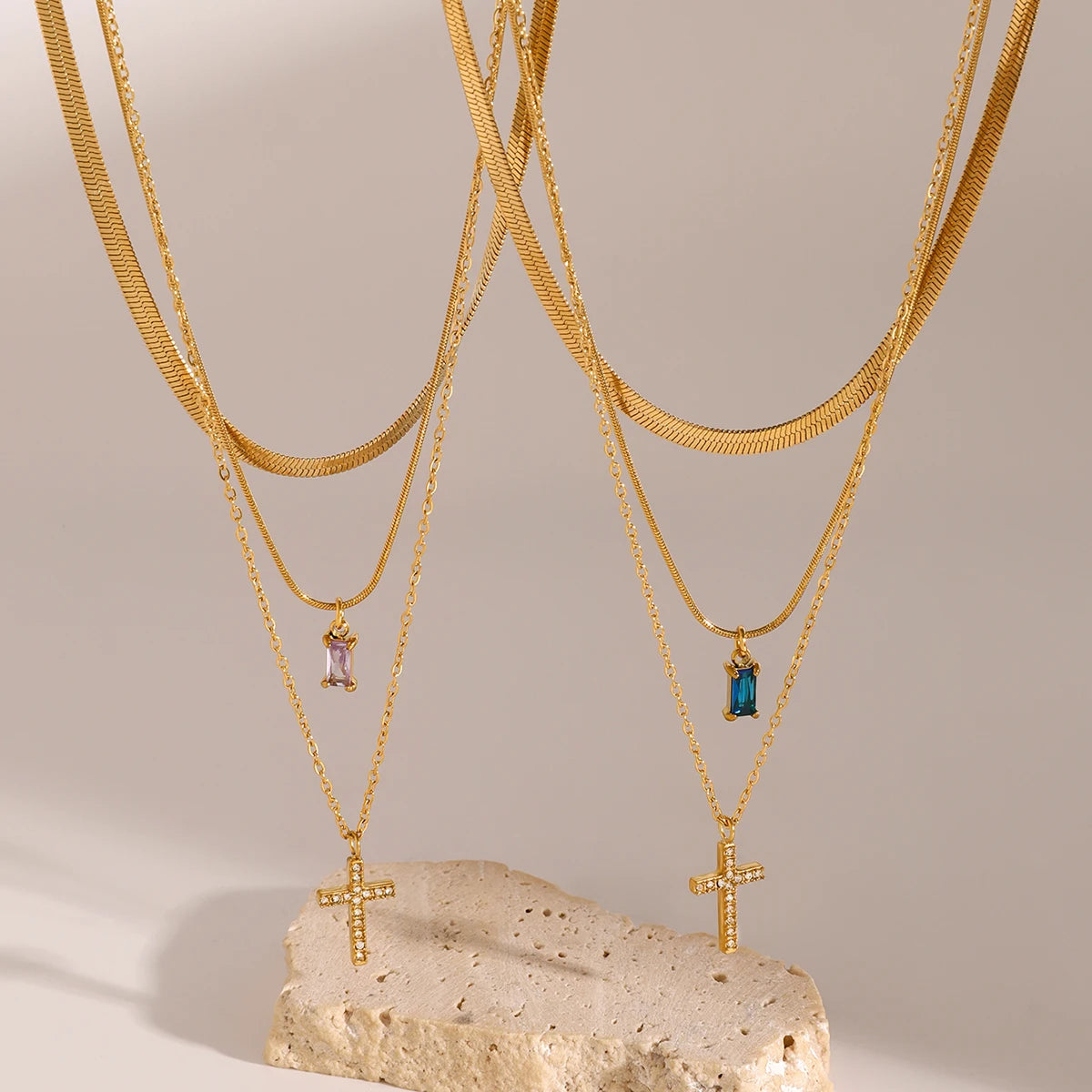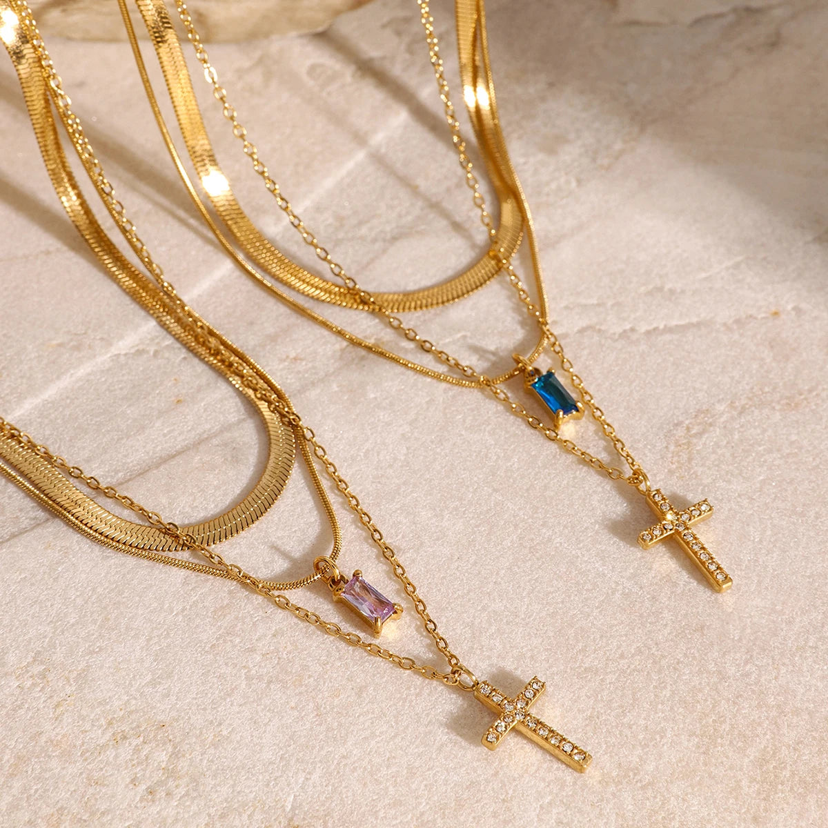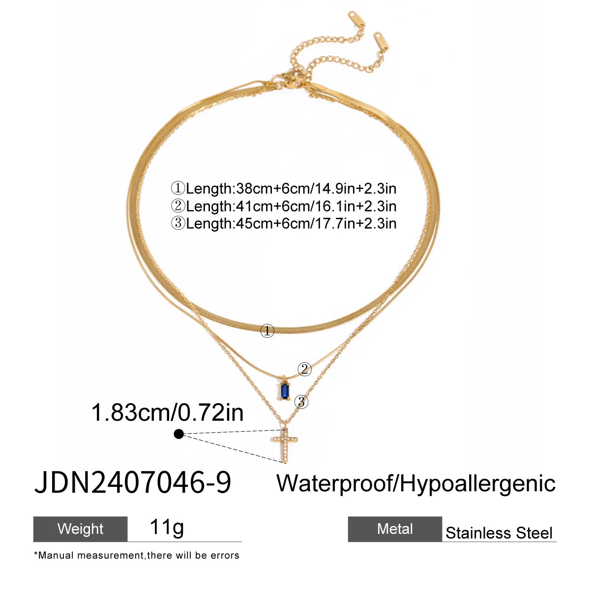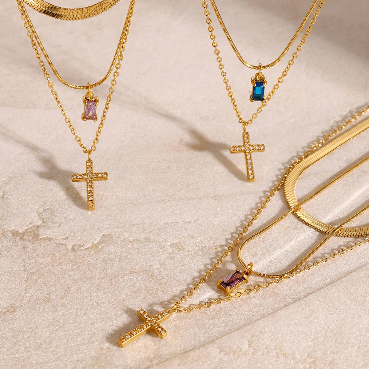 ステンレス304 低ニッケル 水に濡れても錆びにくい 18Kゴールドメッキ ネックレス クロス ジルコニア 誕生石 【YJ03107】
