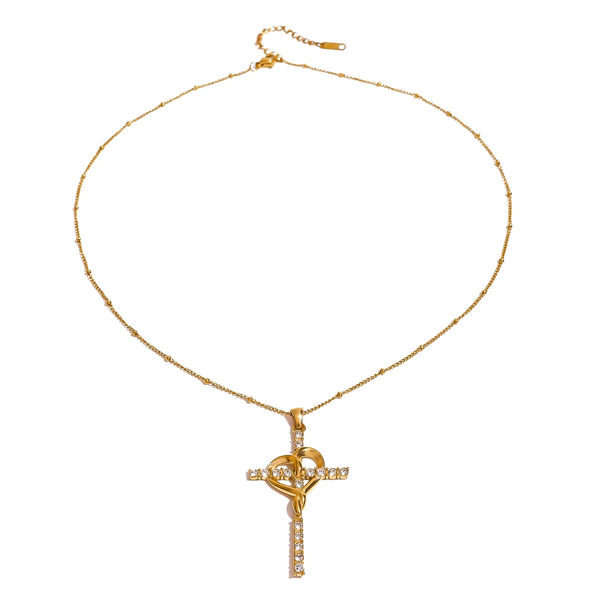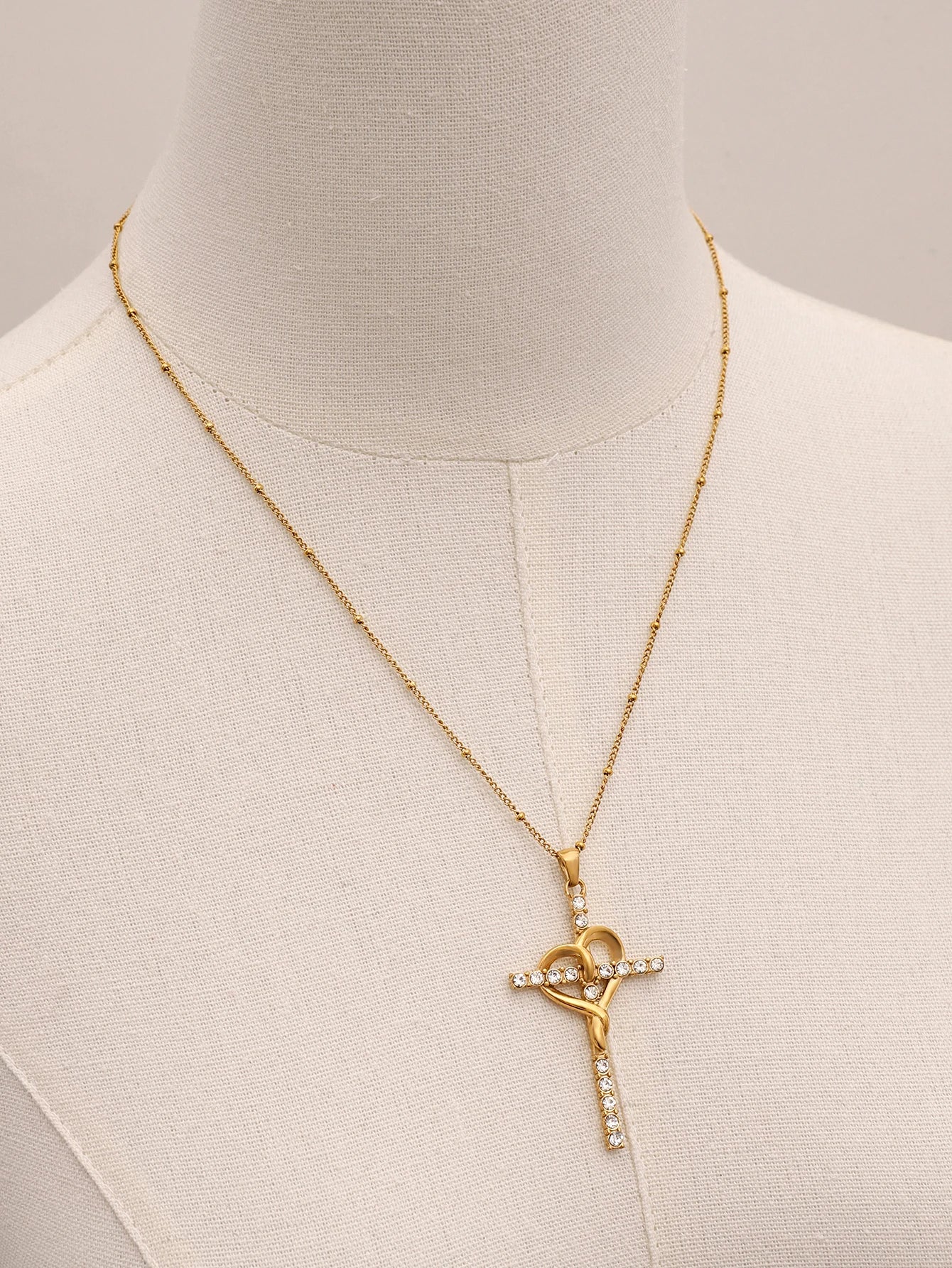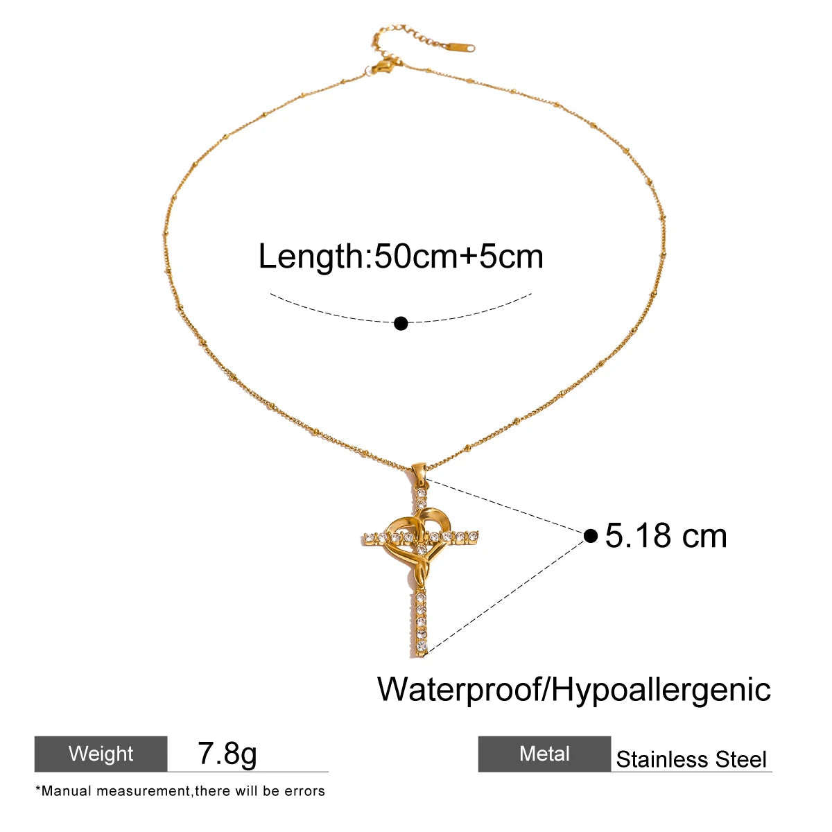 ステンレス304 低ニッケル 水に濡れても錆びにくい 18Kゴールドメッキ ネックレス クロス ハート ジルコニア 【YJ03187】