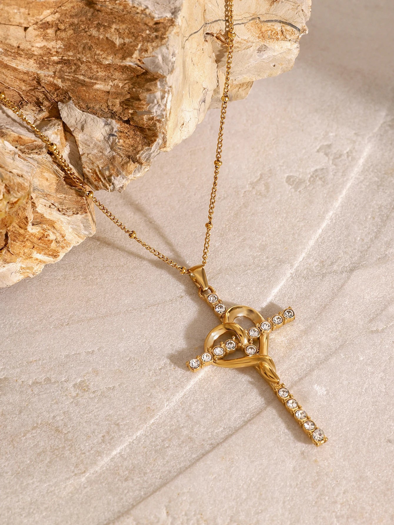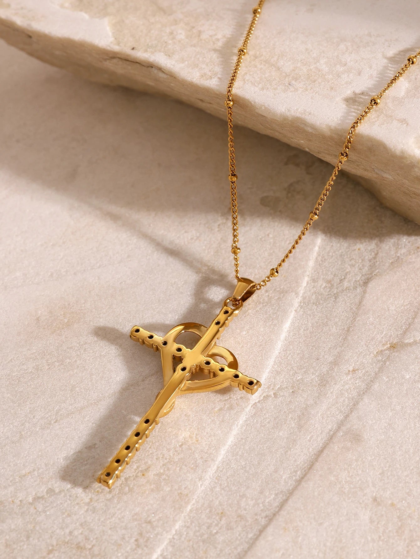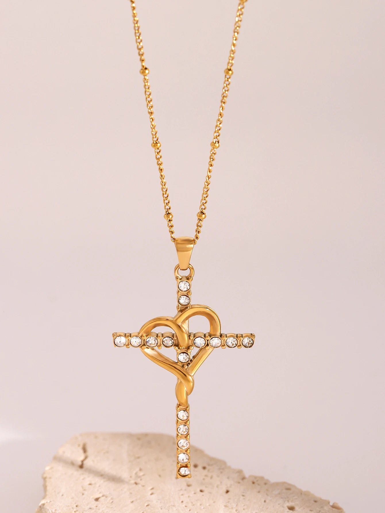 ステンレス304 低ニッケル 水に濡れても錆びにくい 18Kゴールドメッキ ネックレス クロス ハート ジルコニア 【YJ03187】