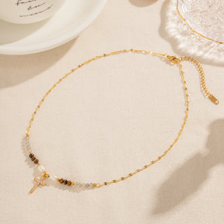 ステンレス304 低ニッケル 水に濡れても錆びにくい 18Kゴールドメッキ ネックレス クロス 天然石風ストーン 【YJ02094】