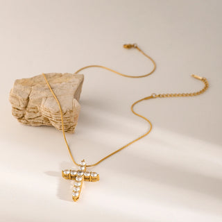 ステンレス304 低ニッケル 水に濡れても錆びにくい 18Kゴールドメッキ ネックレス クロス ジルコニア パール ビーズ【YJ03552】