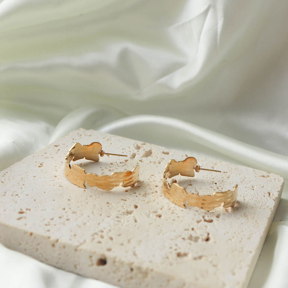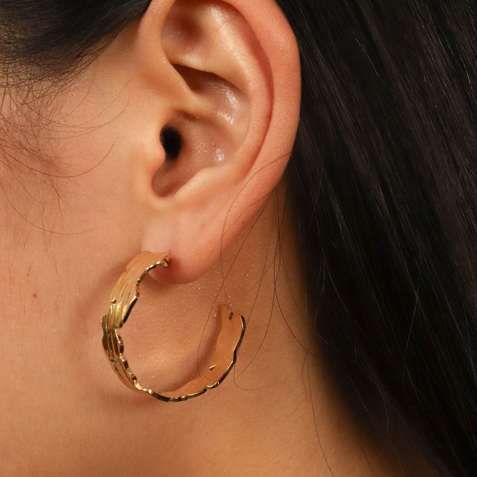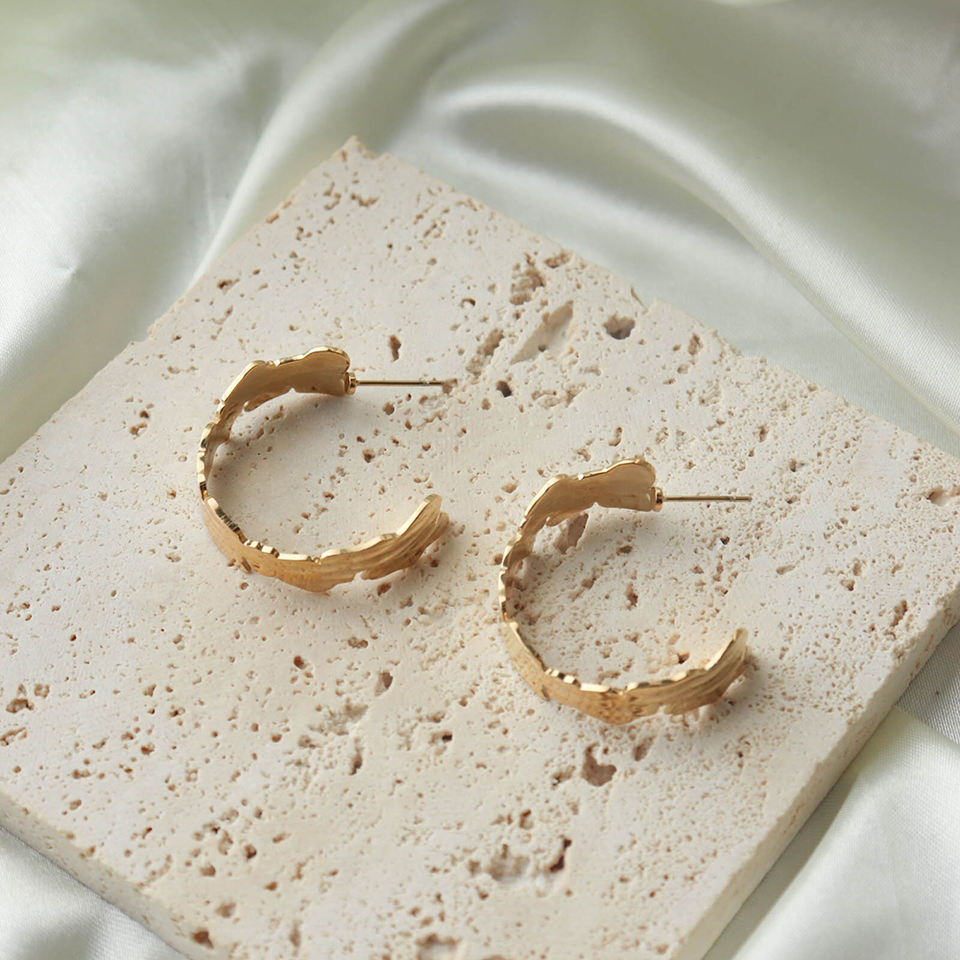 • ピアスのポスト部分は素材の特性上、キャッチがきつく感じられる場合や、スムーズに取り外せないことがありますが、これは不良品ではありませんのでご了承ください。特に新品時はゴールドメッキコーティングの厚みにより、やや固めに感じることがございます。無理に力を加えるとポストの曲がりや破損につながる可能性があるため、優しくゆっくりと着脱いただくことをおすすめします。