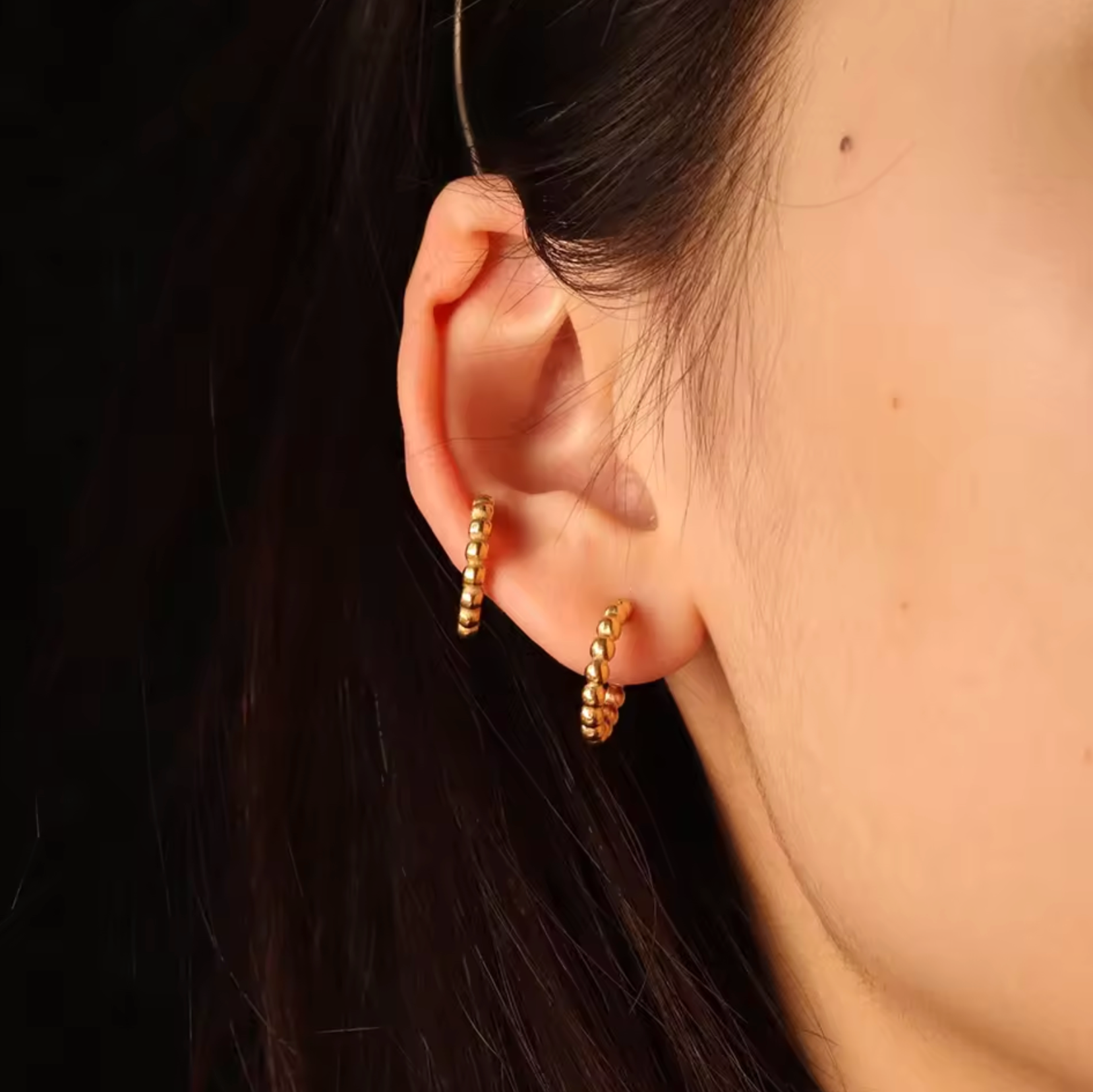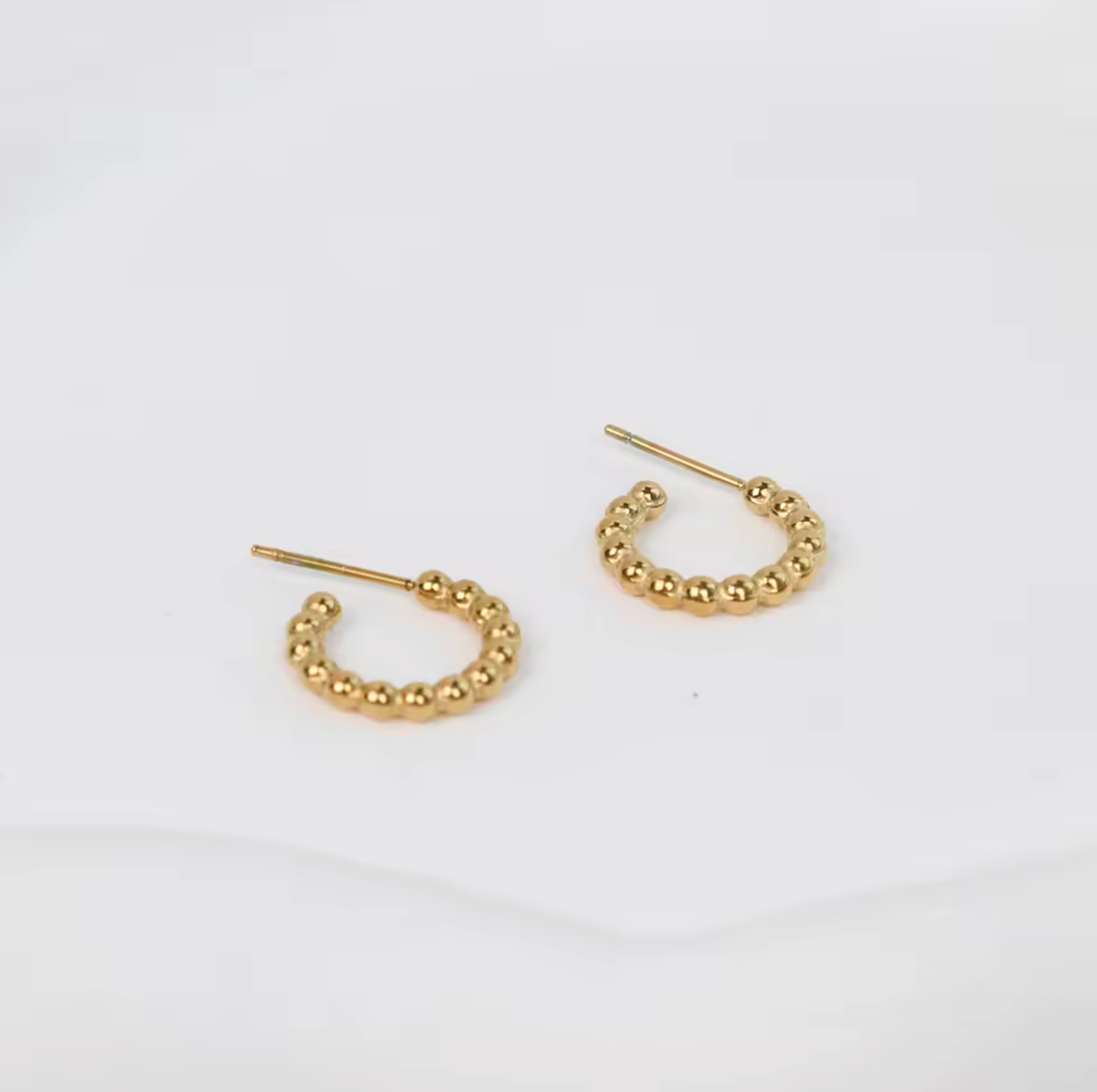 - ピアスのポスト部分は素材の特性上、キャッチがきつく感じられる場合や、スムーズに取り外せないことがありますが、これは不良品ではありませんのでご了承ください。特に新品時はゴールドメッキコーティングの厚みにより、やや固めに感じることがございます。無理に力を加えるとポストの曲がりや破損につながる可能性があるため、優しくゆっくりと着脱いただくことをおすすめします。