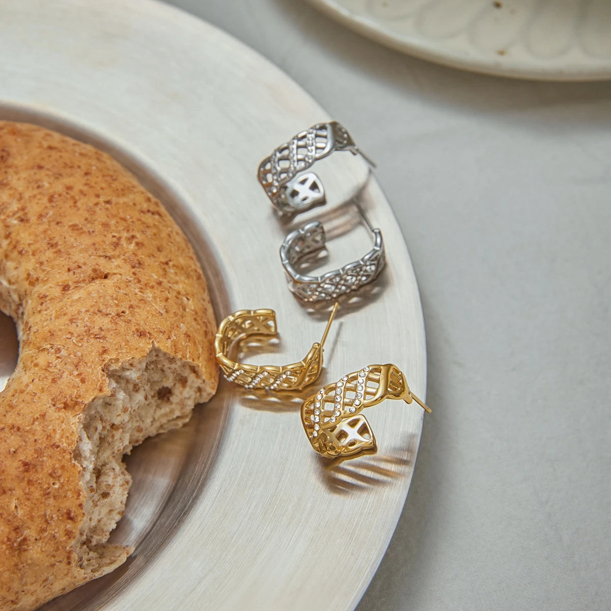 - ピアスのポスト部分は素材の特性上、キャッチがきつく感じられる場合や、スムーズに取り外せないことがありますが、これは不良品ではありませんのでご了承ください。特に新品時はゴールドメッキコーティングの厚みにより、やや固めに感じることがございます。無理に力を加えるとポストの曲がりや破損につながる可能性があるため、優しくゆっくりと着脱いただくことをおすすめします。