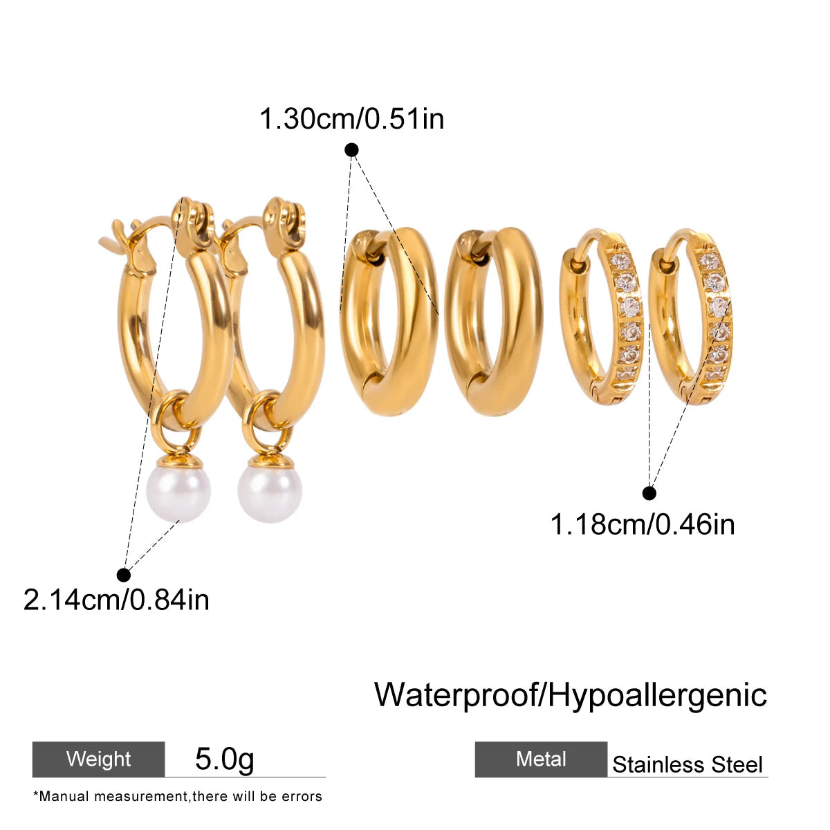 ステンレス304 ニッケルフリー 水に濡れても錆びにくい 18Kゴールドメッキ フープ ピアス ジルコニア パール 3点セット 【YJ00792】
