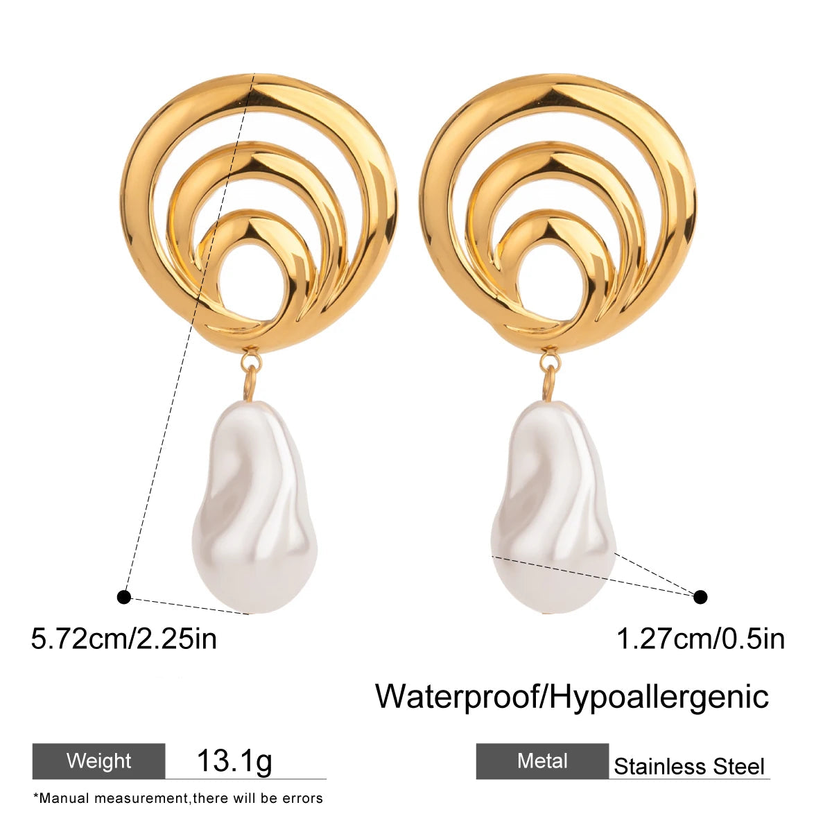 ステンレス304 低ニッケル 水に濡れても錆びにくい 18Kゴールドメッキ ピアス スパイラル パール 【YJ03125】