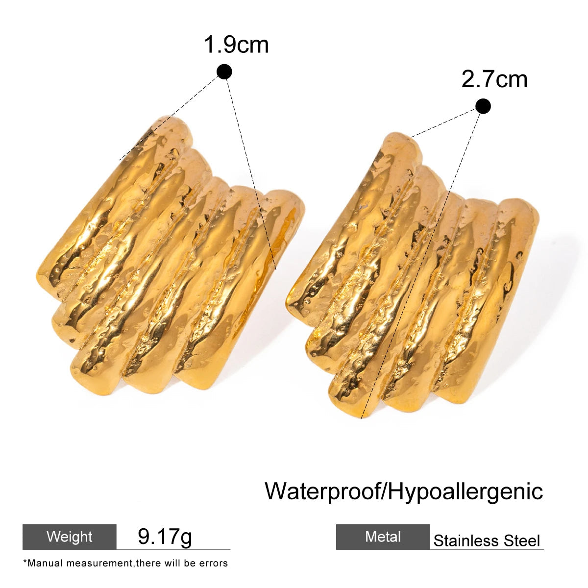- ピアスのポスト部分は素材の特性上、キャッチがきつく感じられる場合や、スムーズに取り外せないことがありますが、これは不良品ではありませんのでご了承ください。特に新品時はゴールドメッキコーティングの厚みにより、やや固めに感じることがございます。無理に力を加えるとポストの曲がりや破損につながる可能性があるため、優しくゆっくりと着脱いただくことをおすすめします。