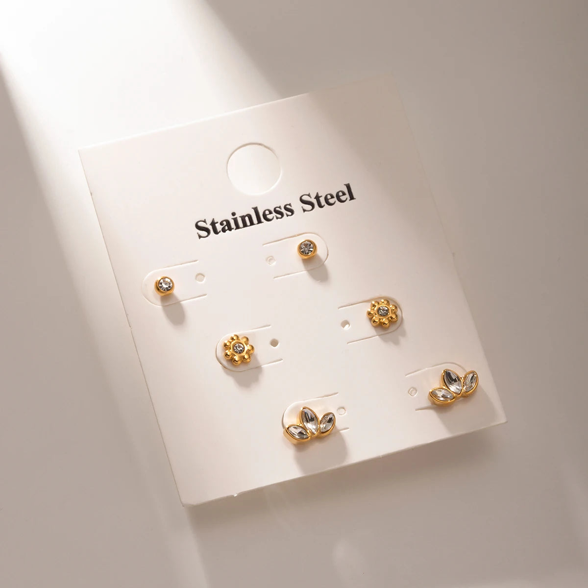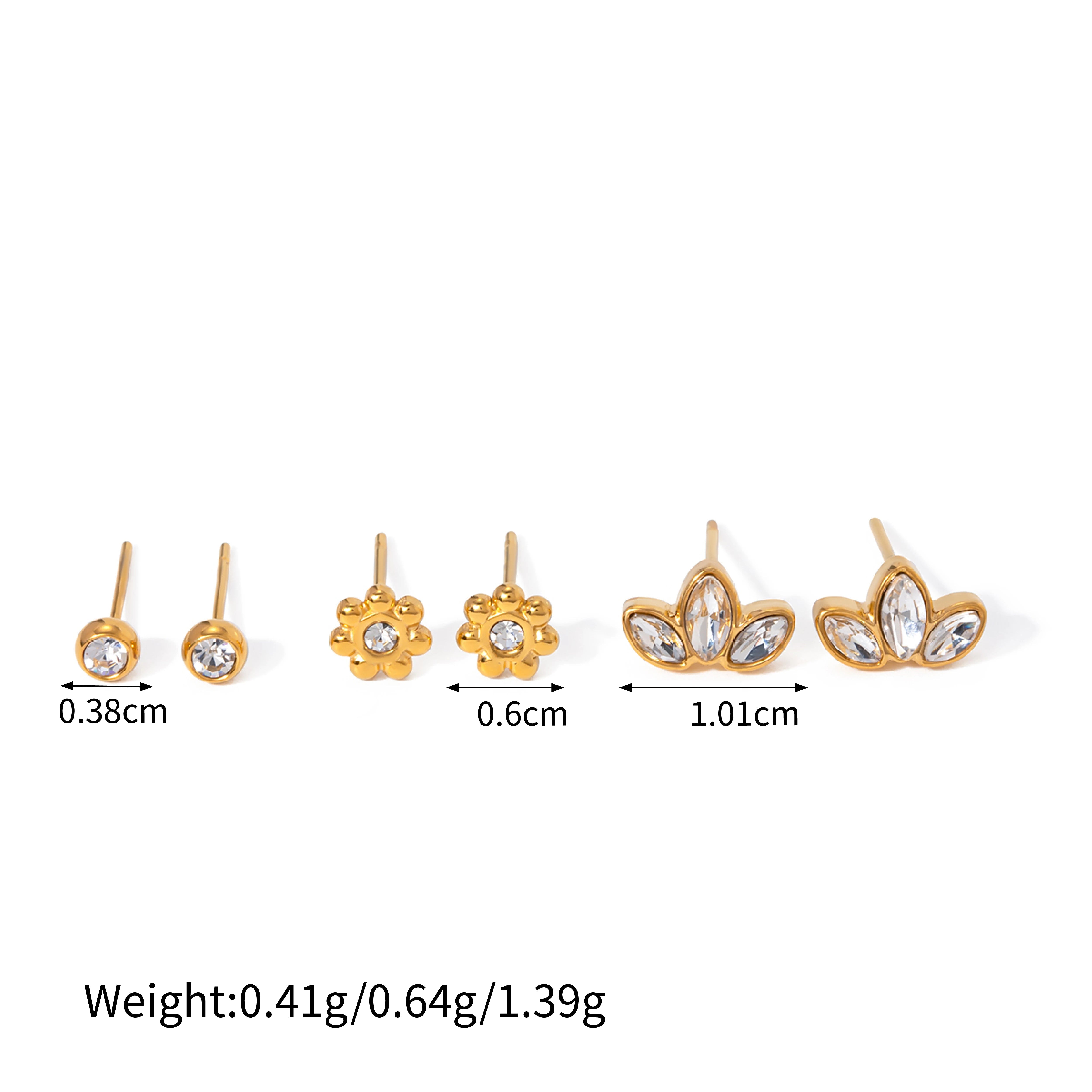 ステンレス304 低ニッケル 水に濡れても錆びにくい 18Kゴールドメッキ ピアス フラワー 花 クリスタル ジルコニア 3点セット【YJ01319】