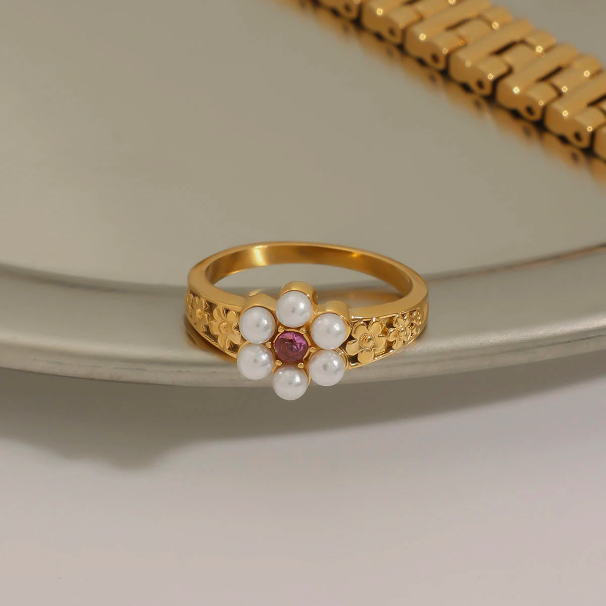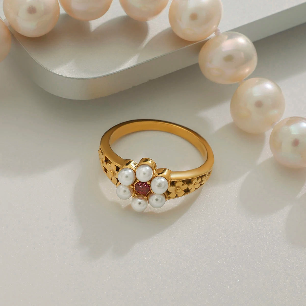 ステンレス304 低ニッケル 水に濡れても錆びにくい 18Kゴールドメッキ リング フラワー 花 パール 【YJ01969】