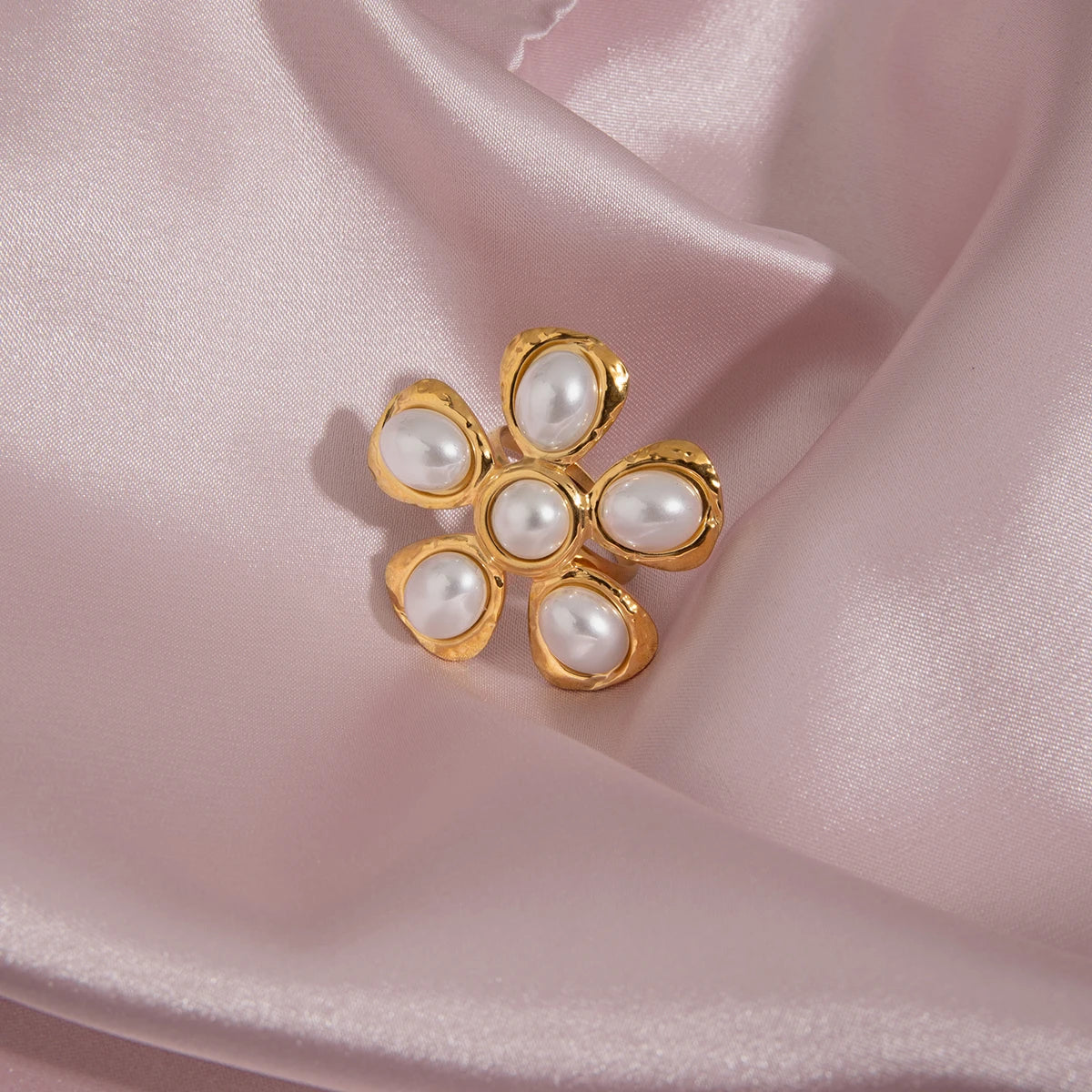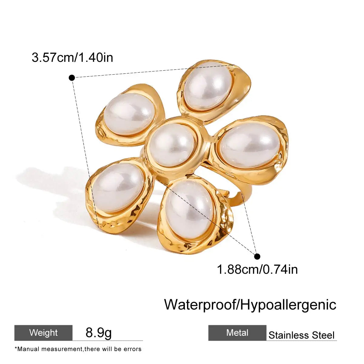 ステンレス304 低ニッケル 水に濡れても錆びにくい 18Kゴールドメッキ リング パール フラワー 花 【YJ02701】