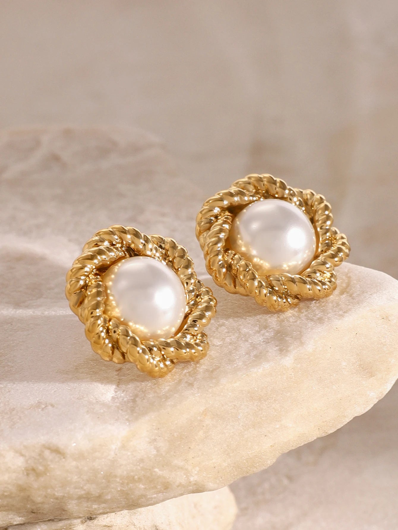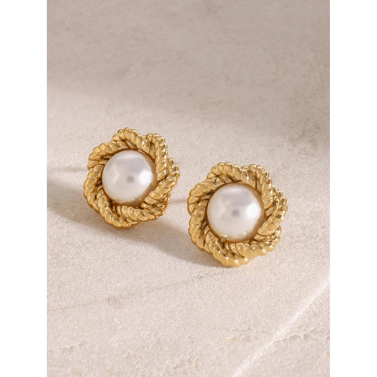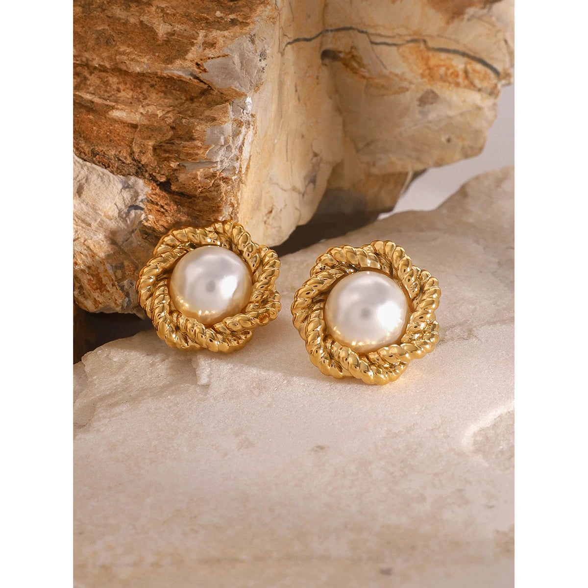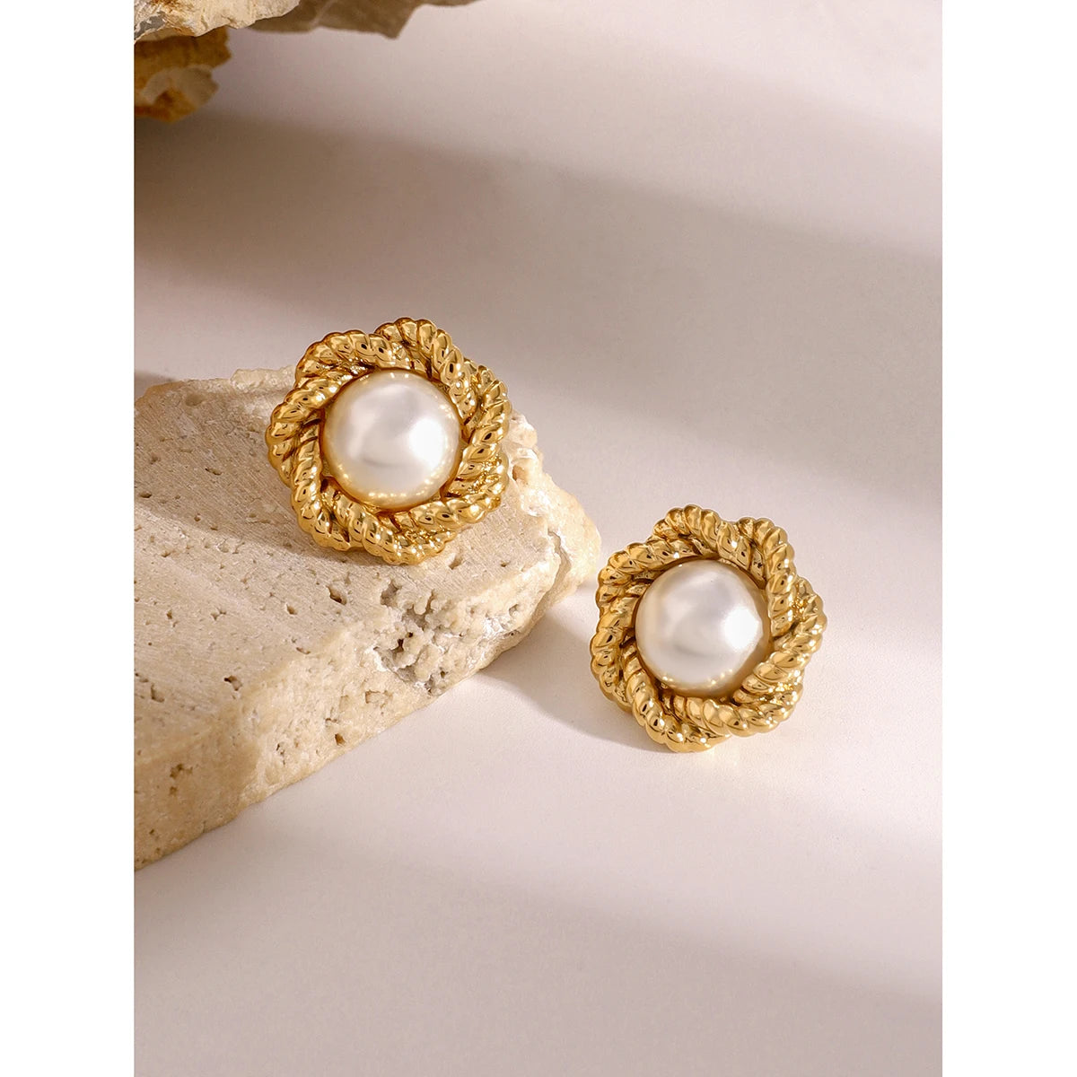 ステンレス304 低ニッケル 水に濡れても錆びにくい 18Kゴールドメッキ ピアス ツイスト フラワー 花 パール 【YJ03013】