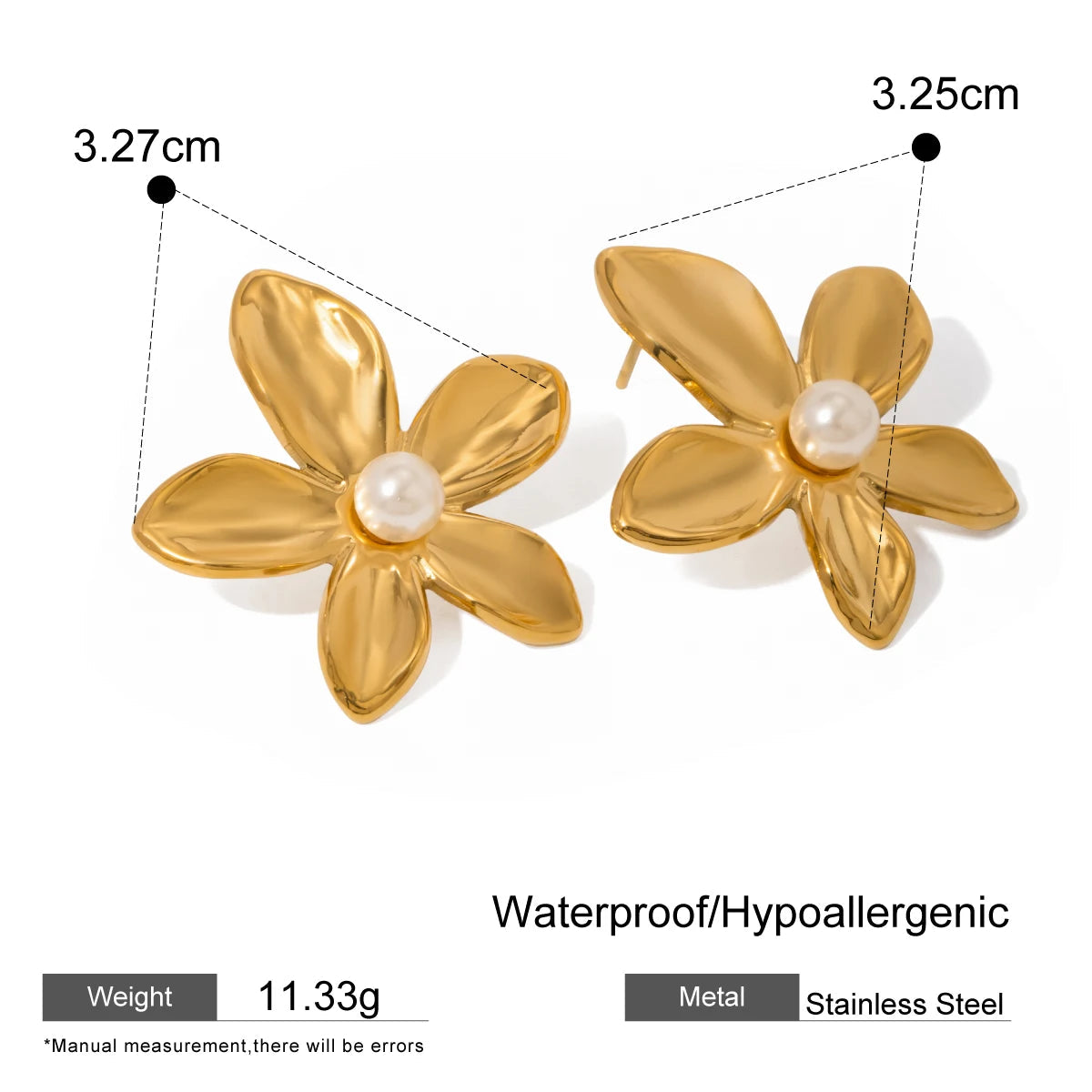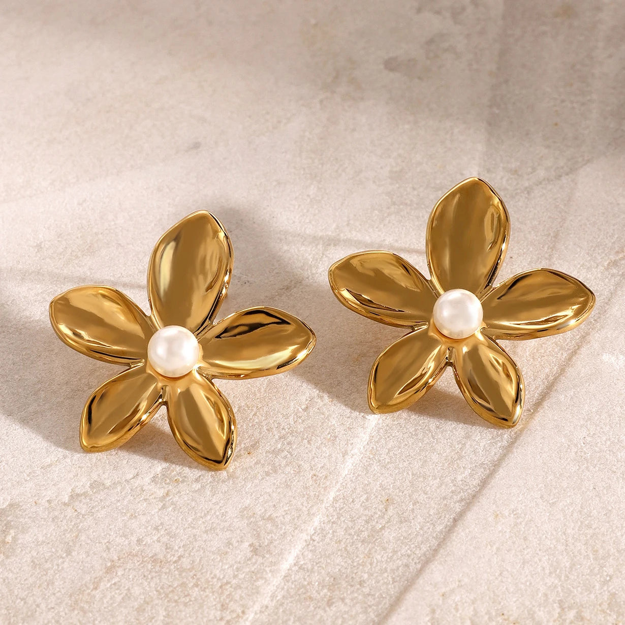 ステンレス304 低ニッケル 水に濡れても錆びにくい 18Kゴールドメッキ ピアス チャンキー フラワー 花 パール 【YJ03708】