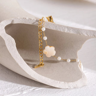 ステンレス304 低ニッケル 水に濡れても錆びにくい 18Kゴールドメッキ ブレスレット シェル フラワー 花 パール 【YJ02843】