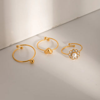 ステンレス304 低ニッケル 水に濡れても錆びにくい 18Kゴールドメッキ リング フラワー 花 ハート 3点セット 【YJ02343】