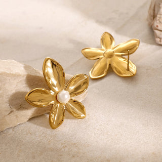 ステンレス304 低ニッケル 水に濡れても錆びにくい 18Kゴールドメッキ ピアス チャンキー フラワー 花 パール 【YJ03708】