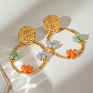 ステンレス304 低ニッケル 水に濡れても錆びにくい 18Kゴールドメッキ ピアス フープ フラワー 花 ビーズ 【YJ03115】