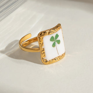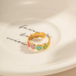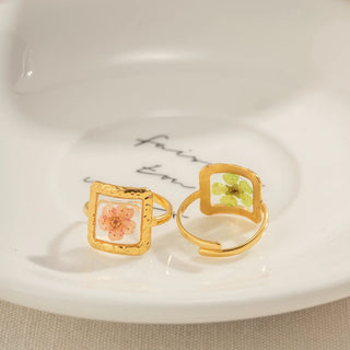 ステンレス304 低ニッケル 水に濡れても錆びにくい 18Kゴールドメッキ リング スクエア フラワー 花 エナメル 【YJ03689】