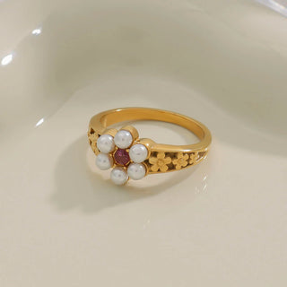 ステンレス304 低ニッケル 水に濡れても錆びにくい 18Kゴールドメッキ リング フラワー 花 パール 【YJ01969】
