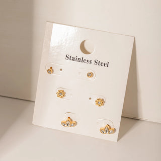 ステンレス304 低ニッケル 水に濡れても錆びにくい 18Kゴールドメッキ ピアス フラワー 花 クリスタル ジルコニア 3点セット【YJ01319】