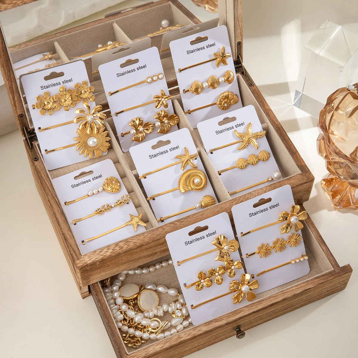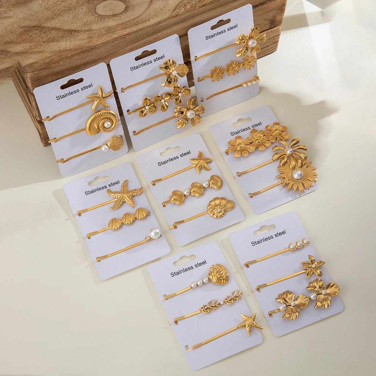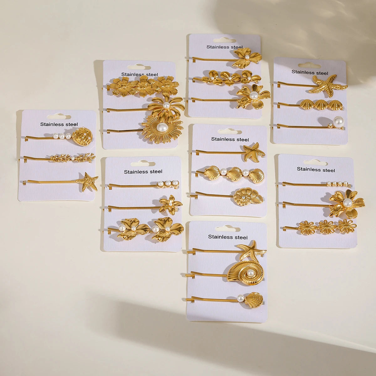 ステンレス304 低ニッケル 水に濡れても錆びにくい 18Kゴールドメッキ ヘアアクセサリー フラワー 花 パール 3点セット【YJ01088】