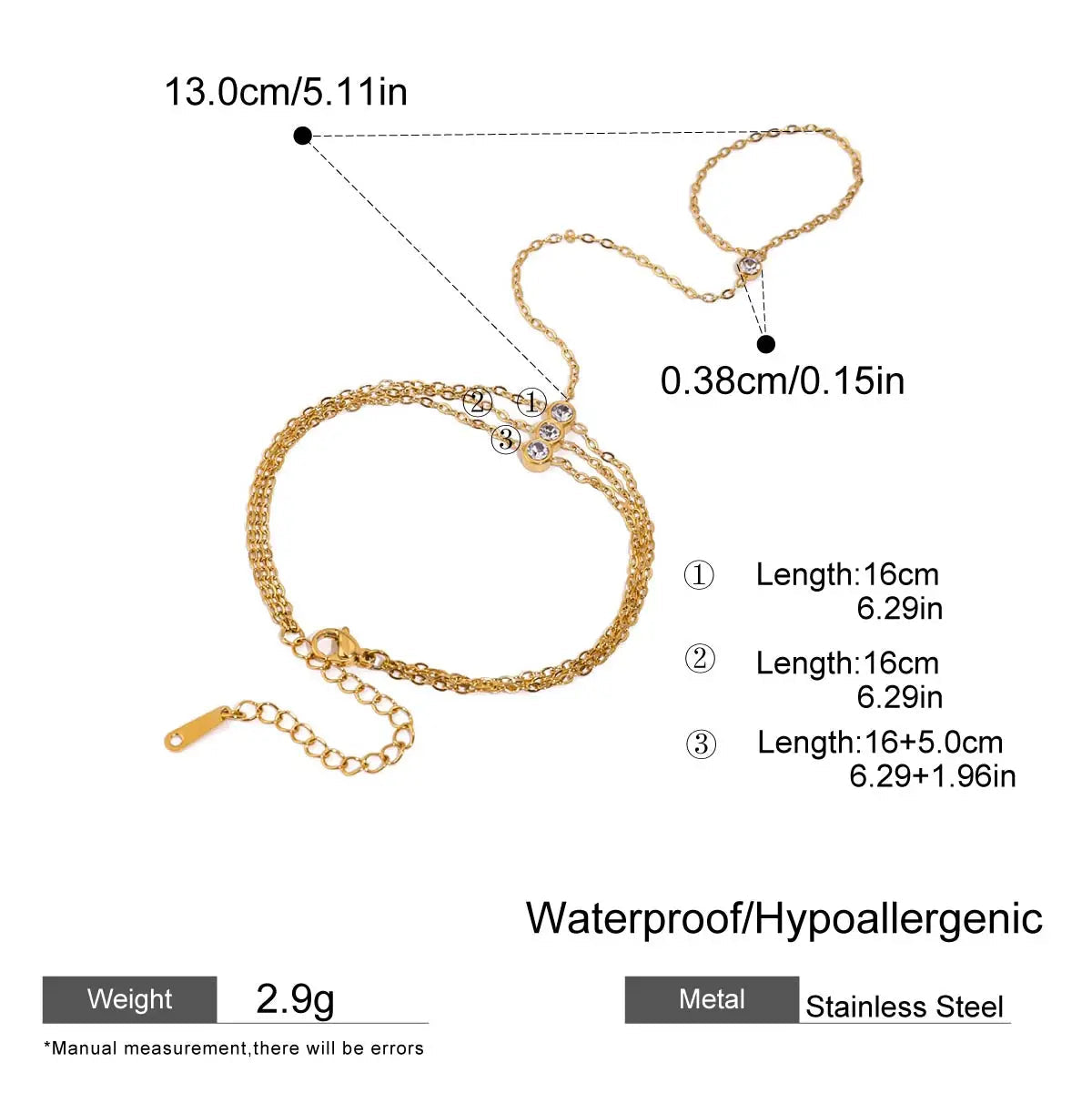 ステンレス304 ニッケルフリー 水に濡れても錆びにくい 18Kゴールドメッキ ハンドチェーン ブレスレット ジルコニア 【YJ00324】