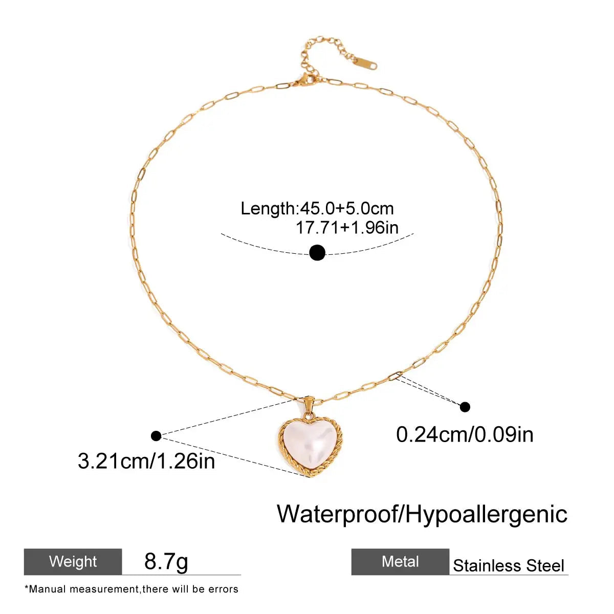 ステンレス304 低ニッケル 水に濡れても錆びにくい 18Kゴールドメッキ ネックレス ハート パール 【YJ02542】