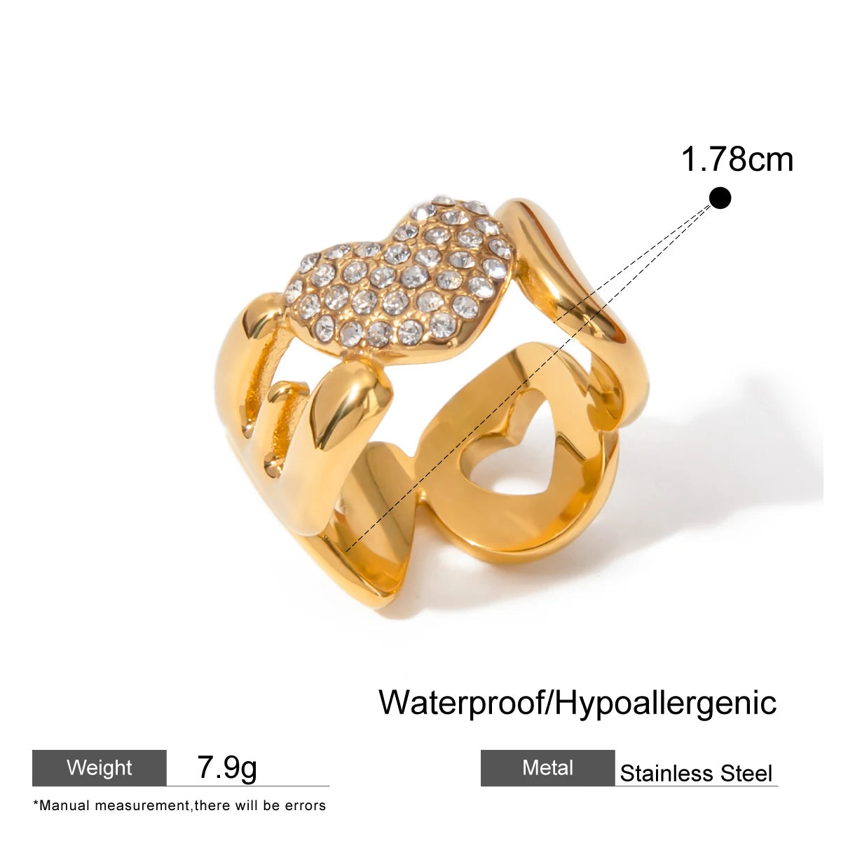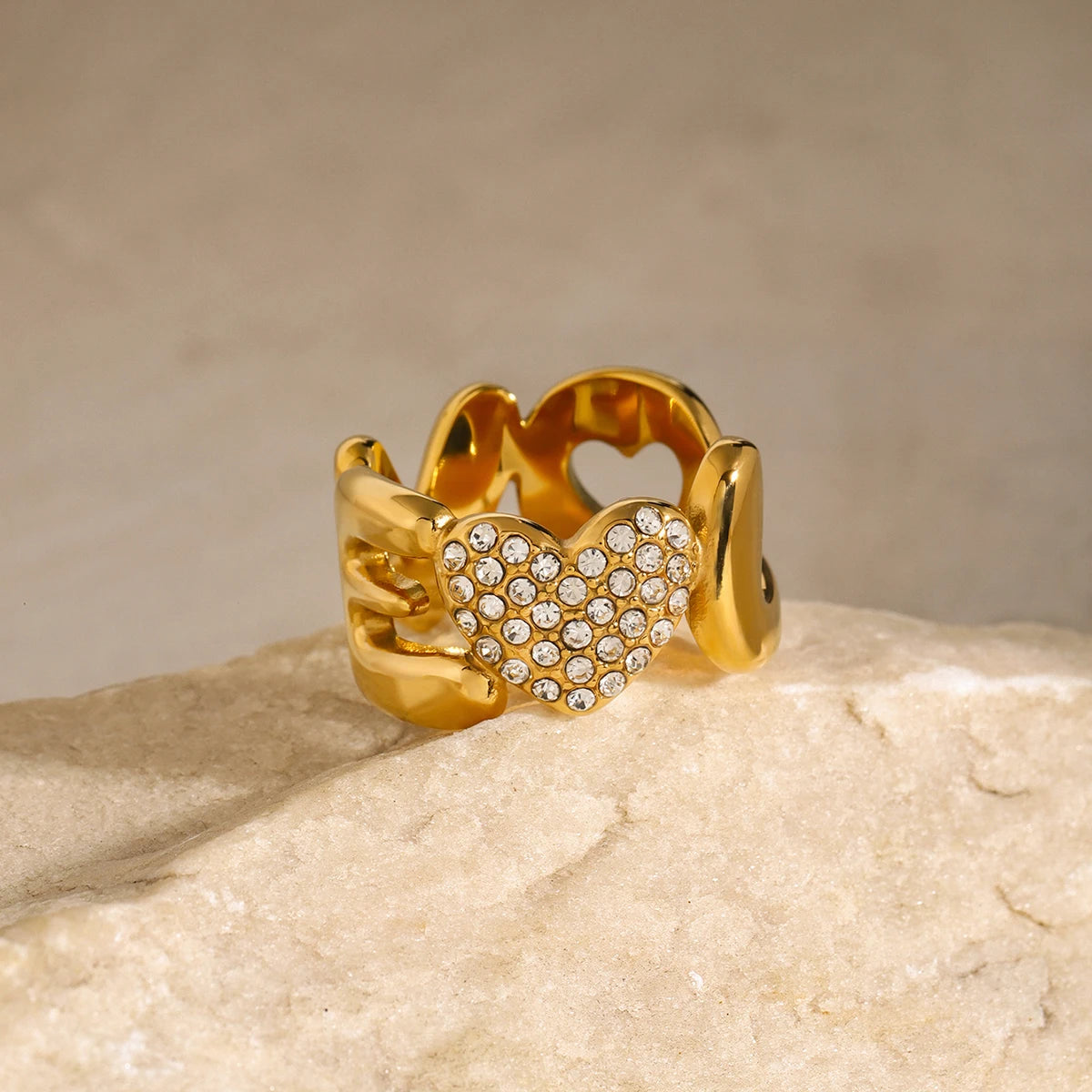 ステンレス304 低ニッケル 水に濡れても錆びにくい 18Kゴールドメッキ リング ジルコニア ハート LOVE 【YJ03819】