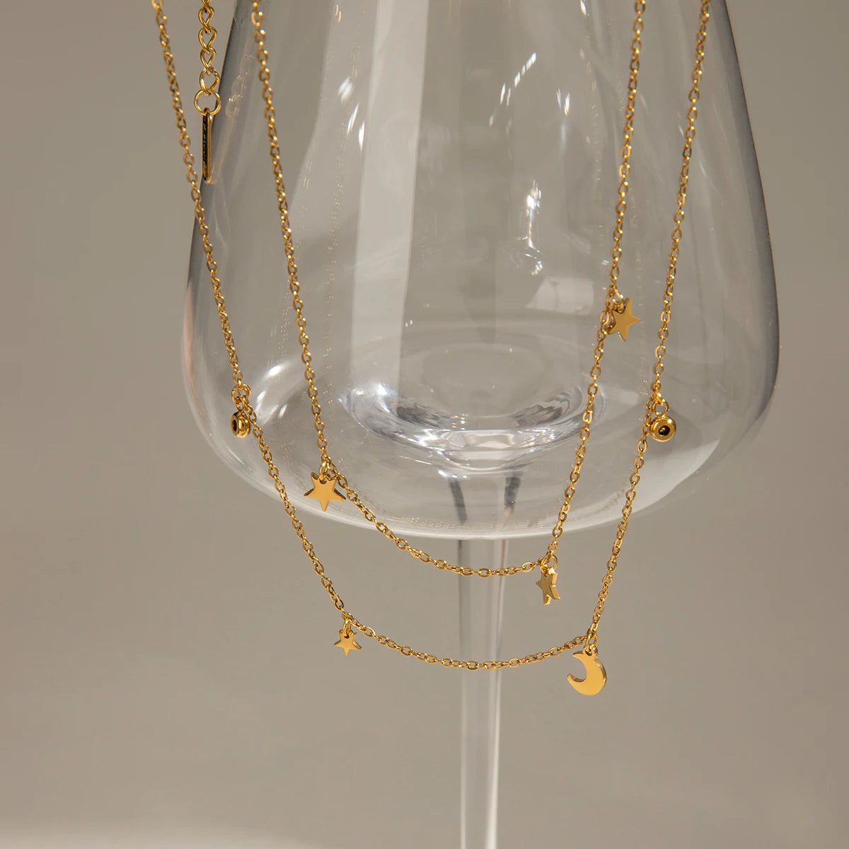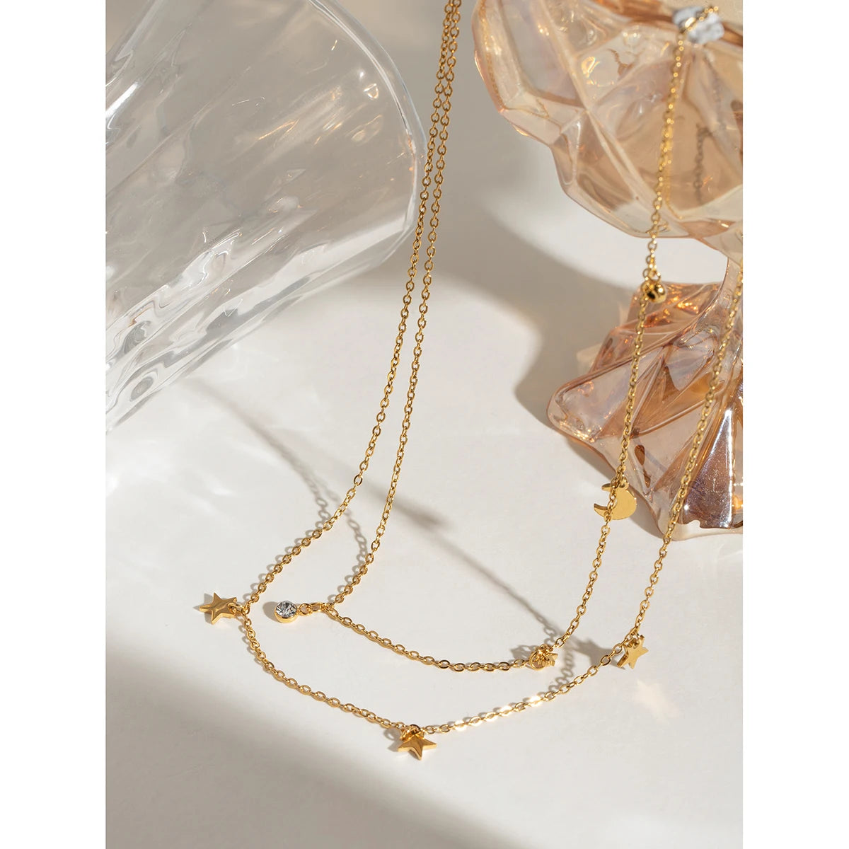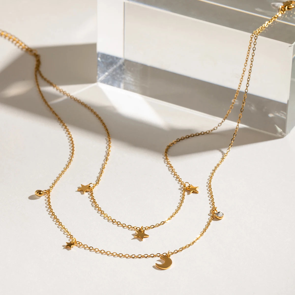 ステンレス304 低ニッケル 水に濡れても錆びにくい 18Kゴールドメッキ ネックレス 2連 スター 星 月 【YJ03067】