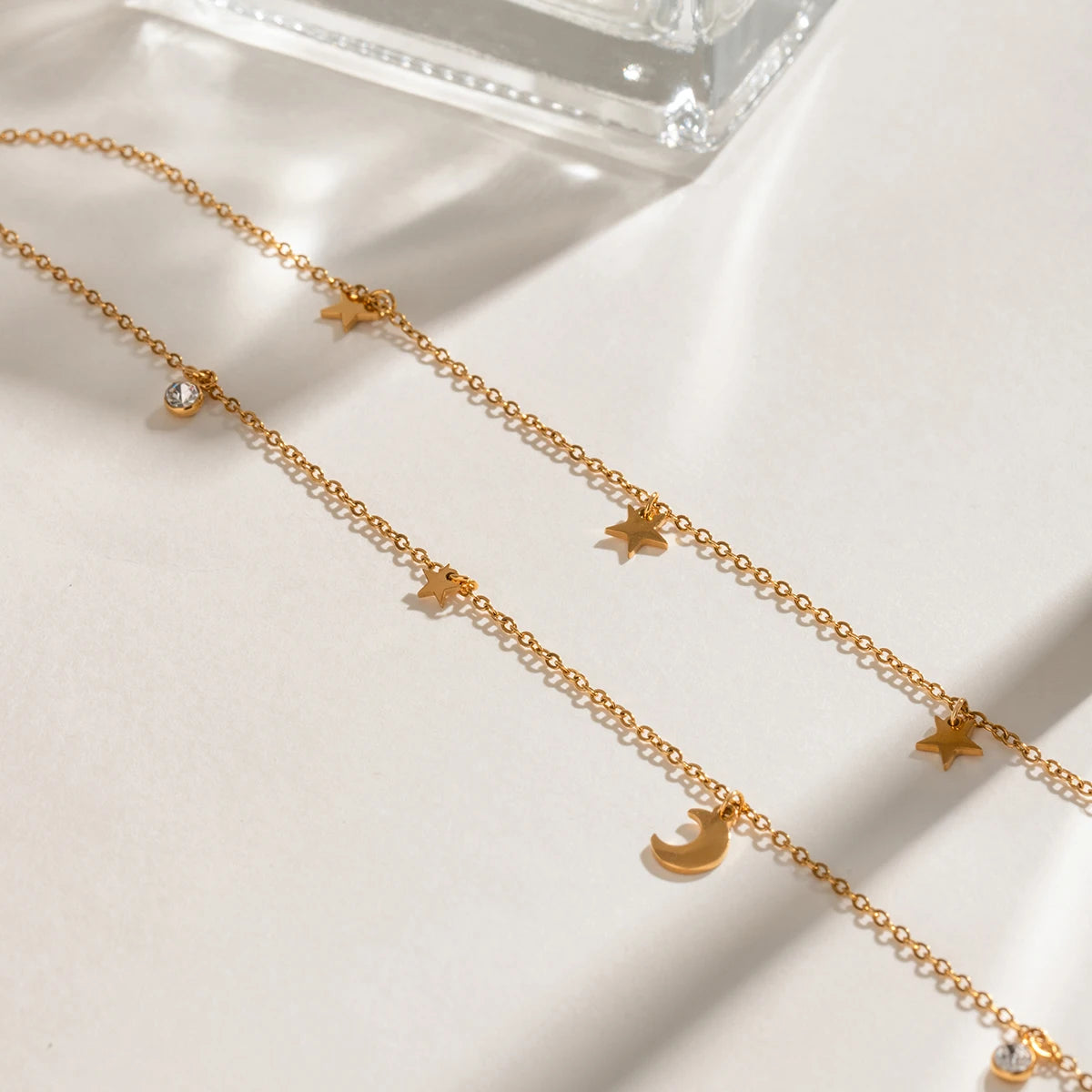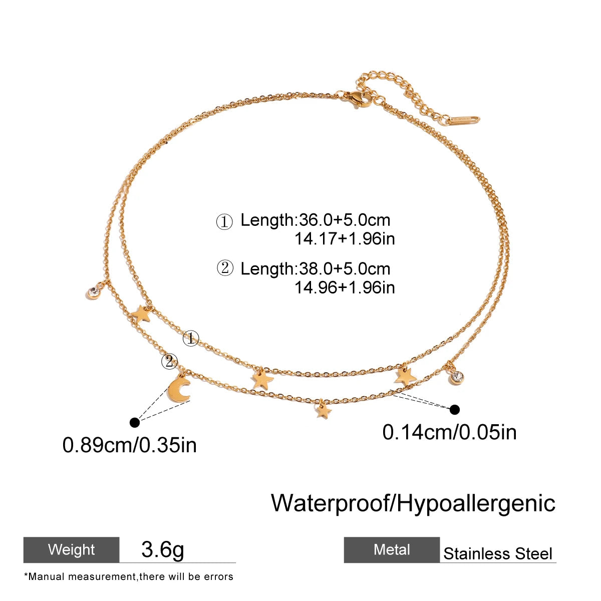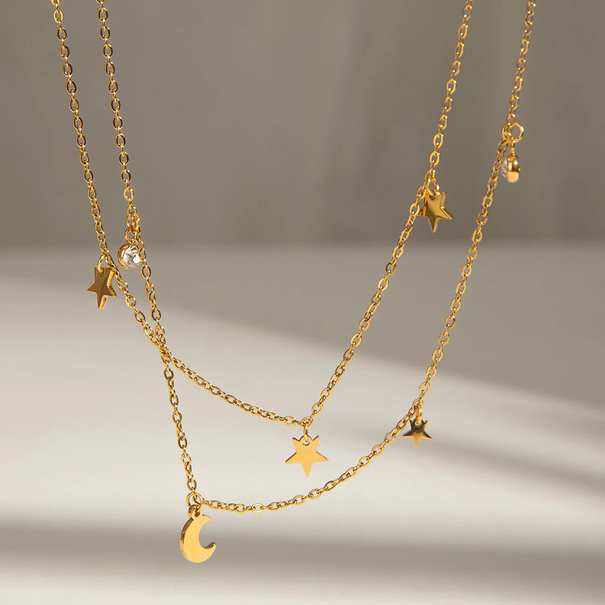 ステンレス304 低ニッケル 水に濡れても錆びにくい 18Kゴールドメッキ ネックレス 2連 スター 星 月 【YJ03067】